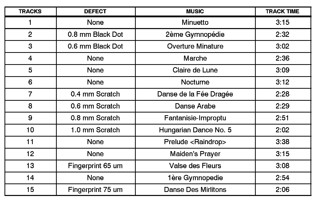 ^ Tracks 1 - 8 and 11 - 14 are reference tracks. They can be used, but the conditions are less severe than track 9. Do NOT use tracks 10 and 15.