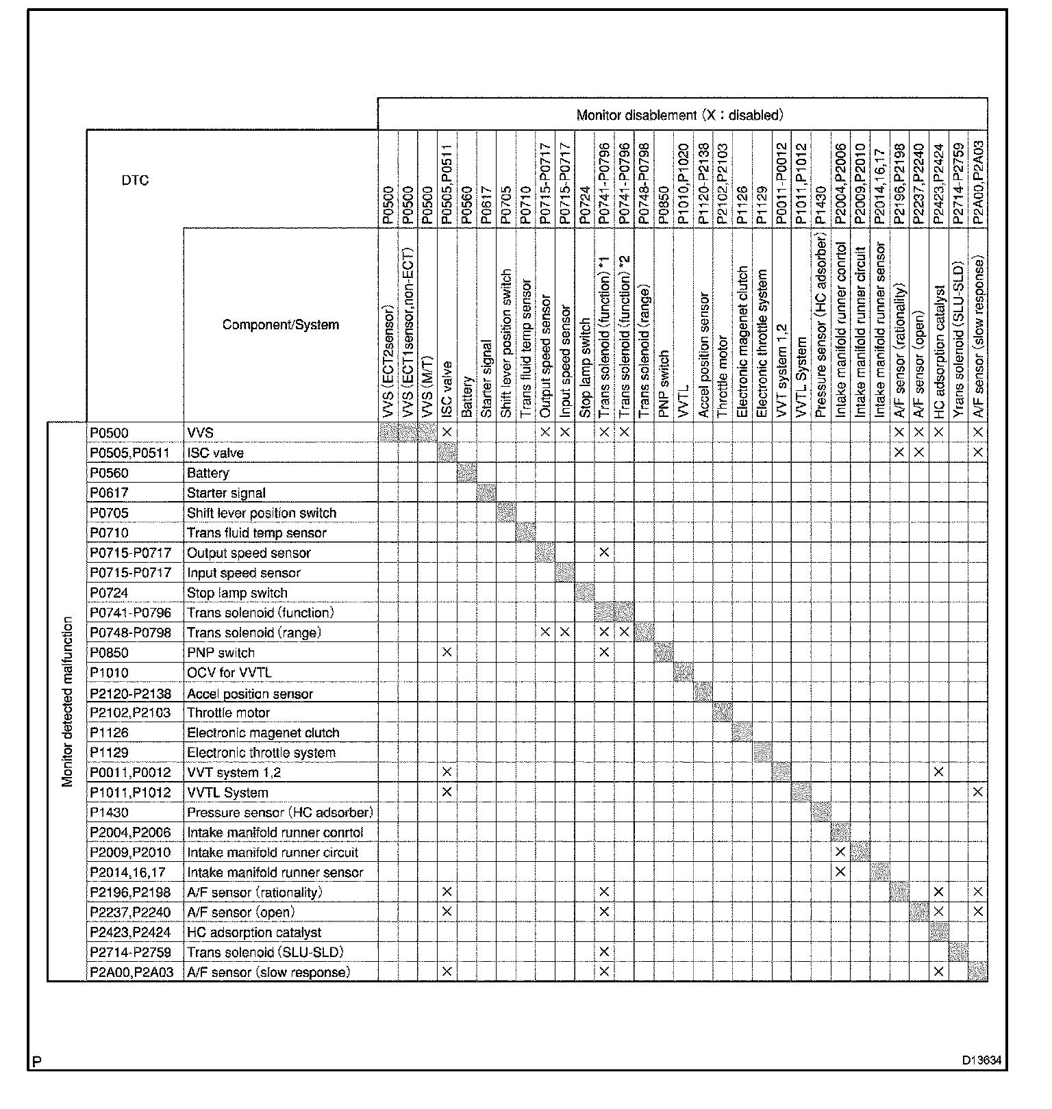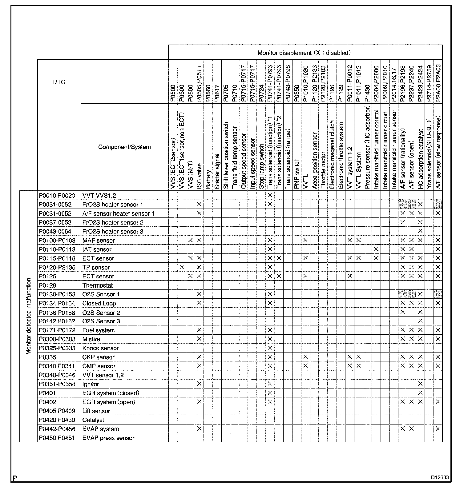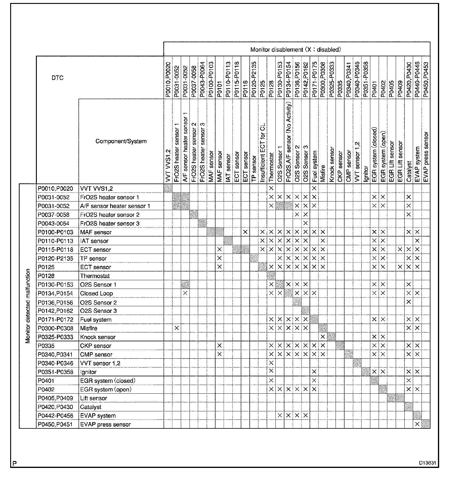 HINT: This table indicates ECM monitoring status for the items in the upper columns if the DTCs in each line on the left are being set.