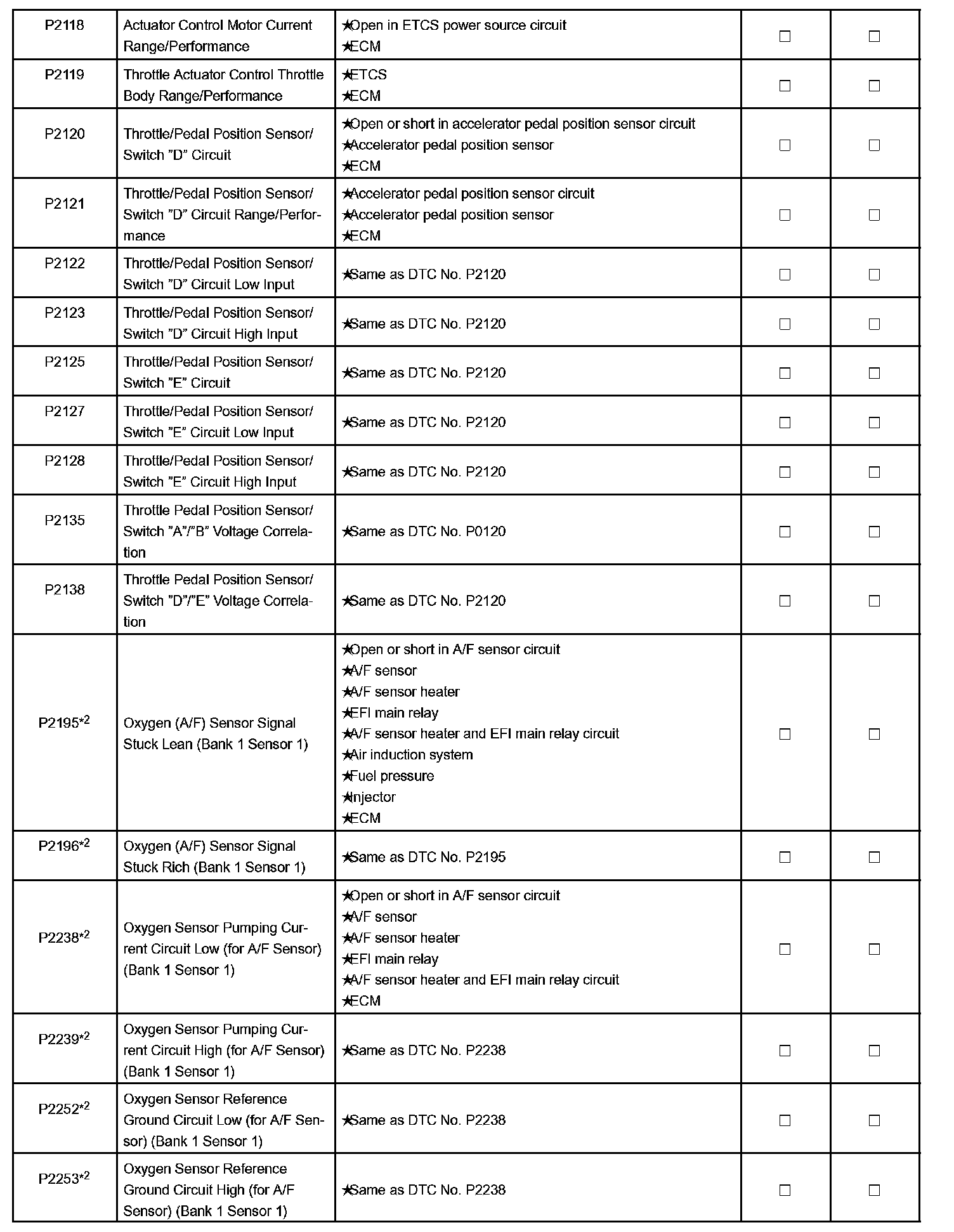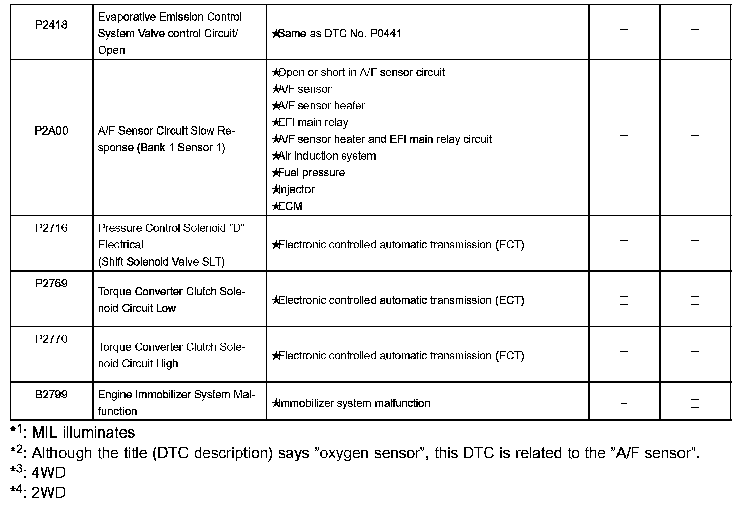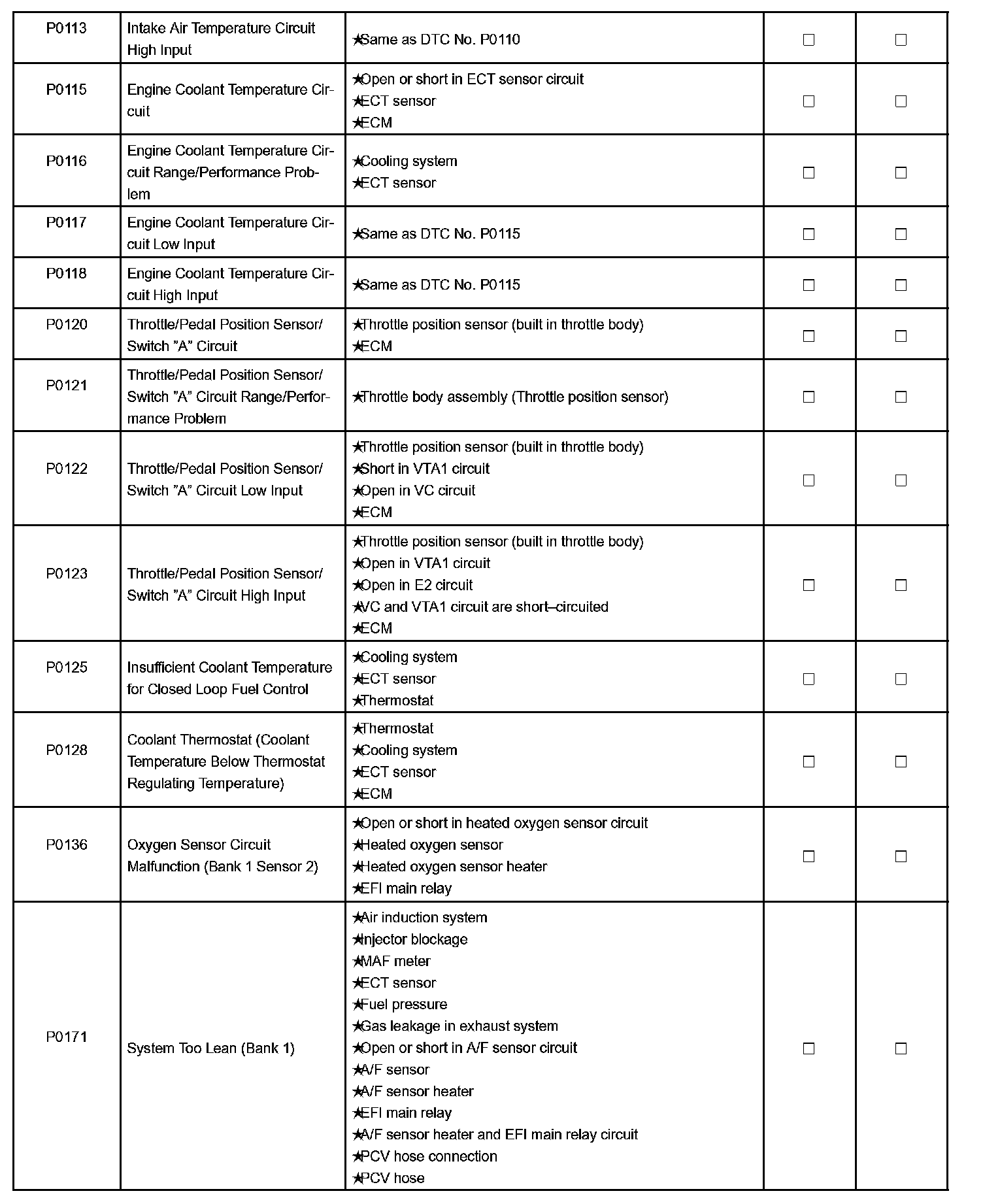 If a malfunction code is displayed during the DTC check in check mode, check the circuit for the code listed in the table. For details of each code, refer to the respective "DTC No" in the DTC chart.