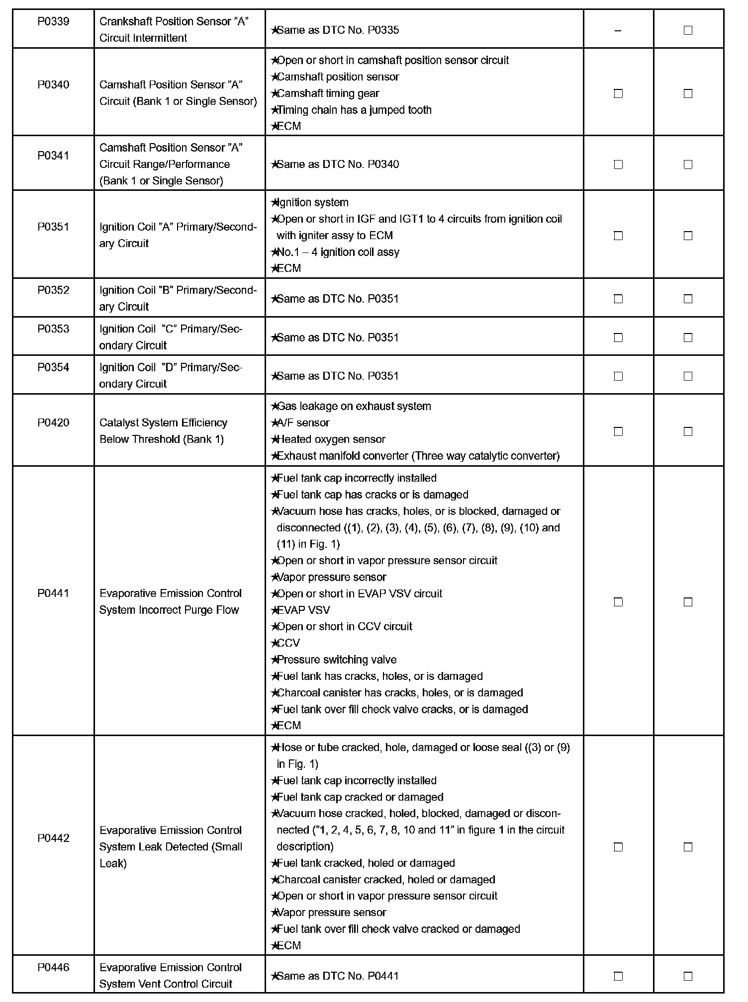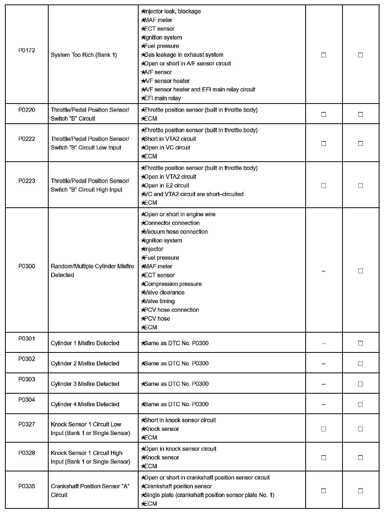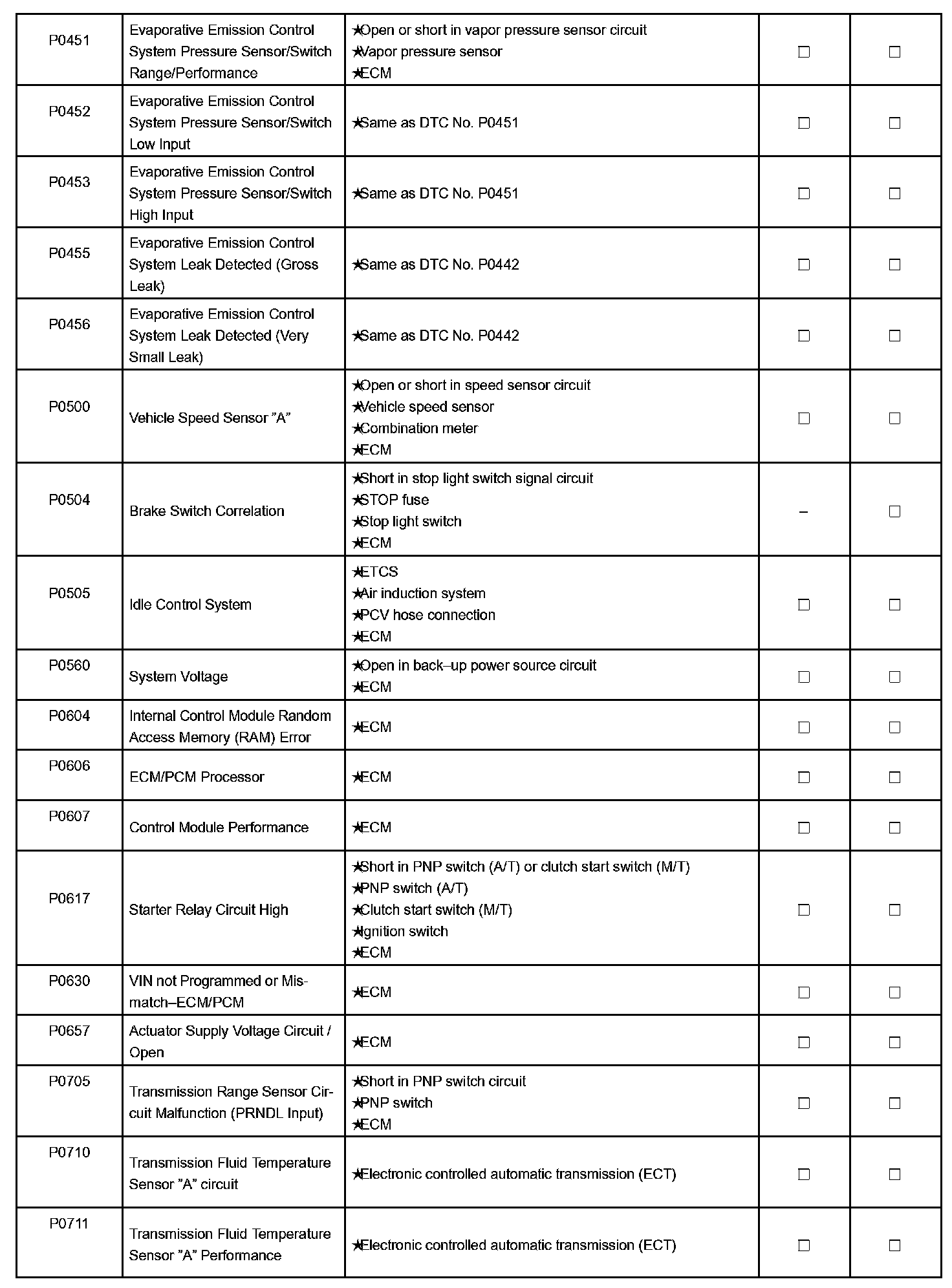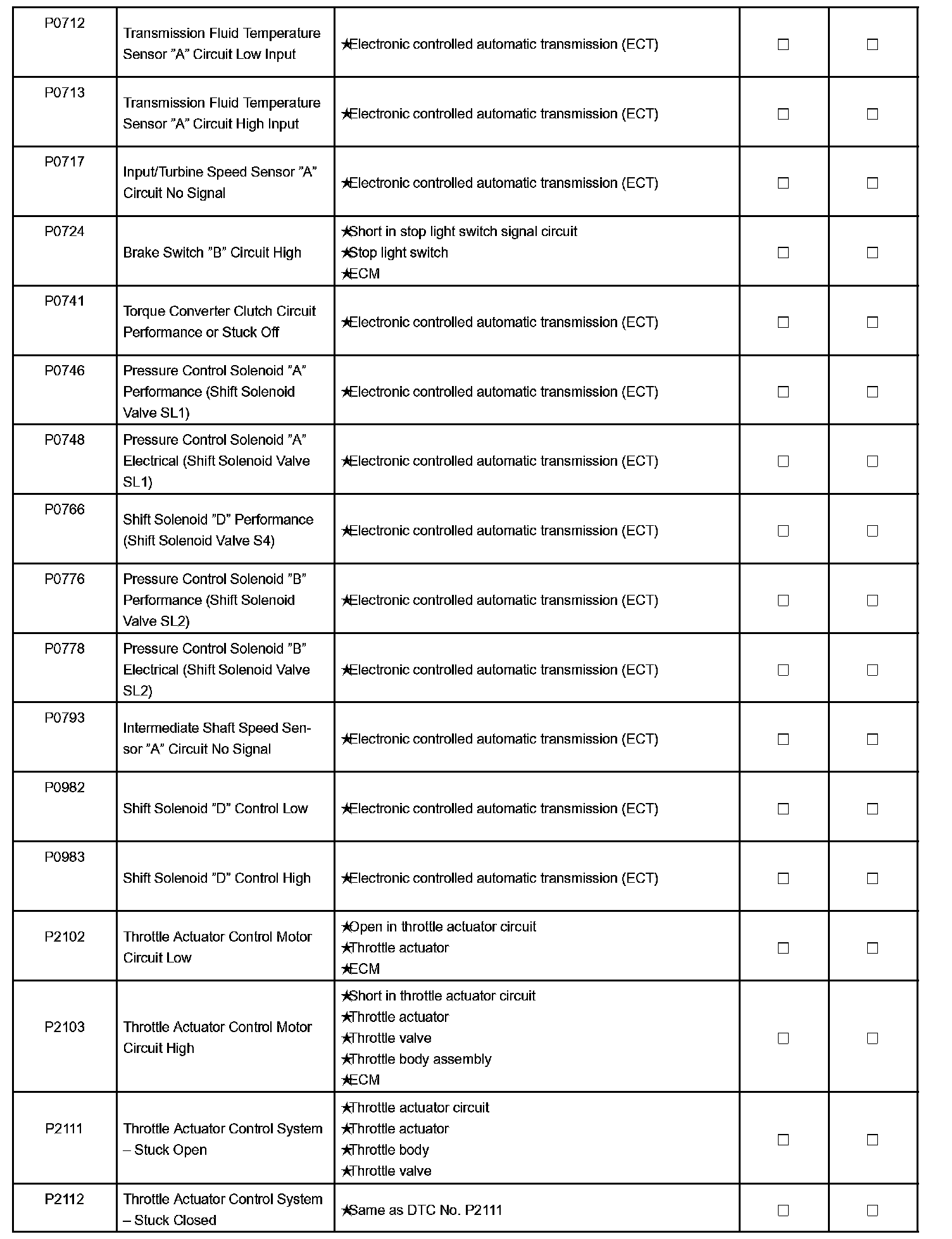 If a malfunction code is displayed during the DTC check in check mode, check the circuit for the code listed in the table. For details of each code, refer to the respective "DTC No" in the DTC chart.