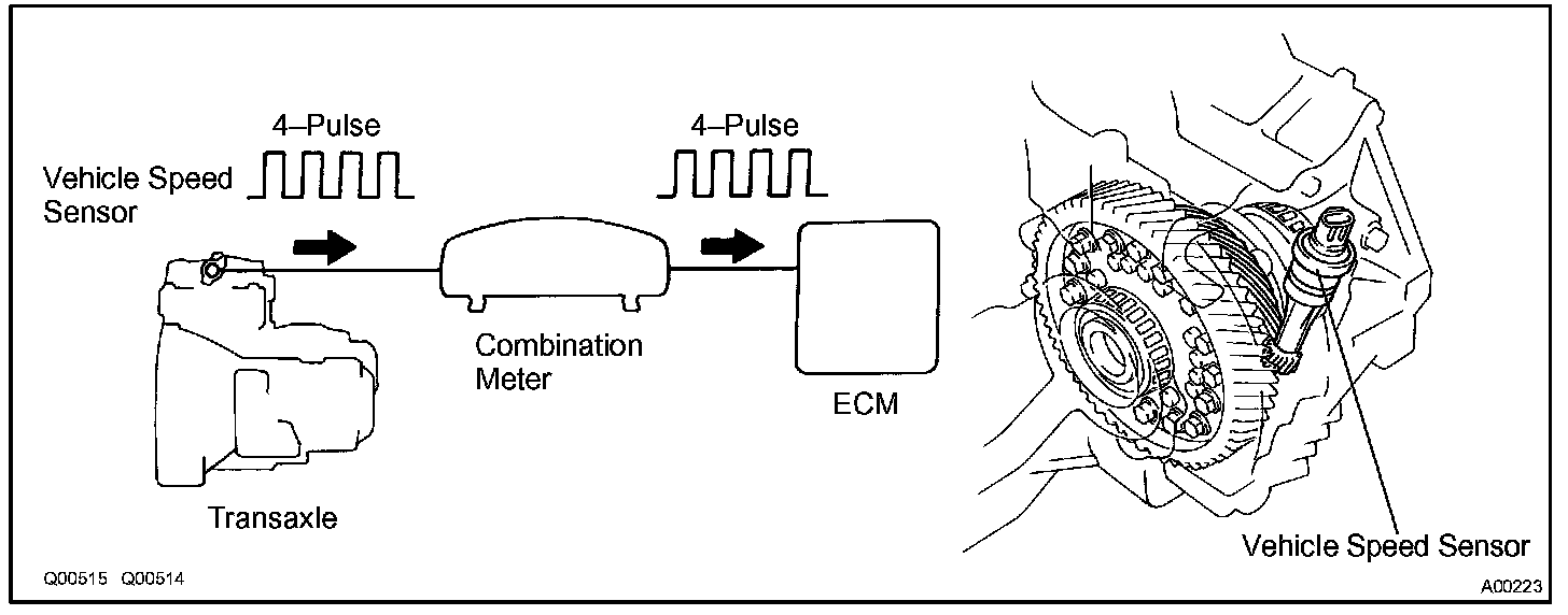The transmission output shaft speed (NC) sensor built into the transmission detects vehicles speed signals (puls signals). These signals are sent to the ECM via the combination meter.