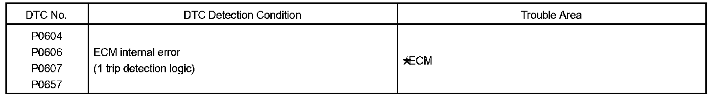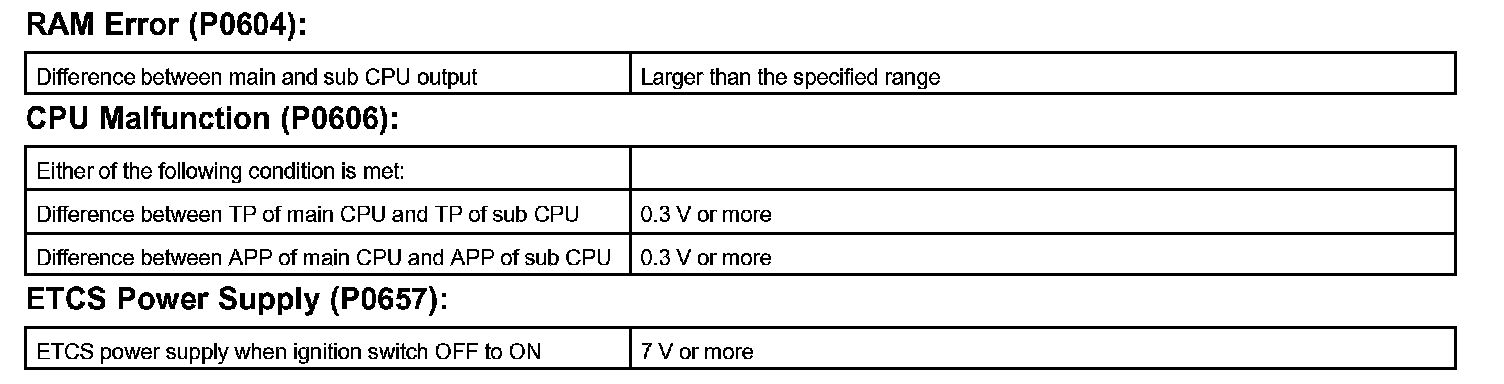 The ECM memory status is diagnosed by internal "mirroring" of the main CPU and the sub CPU to detect random access memory (RAM) errors. The two CPUs also perform continuous mutual monitoring. The ECM sets a DTC if: 1) outputs from the 2 CPUs are different and deviate from the standards, 2) the signals to the throttle actuator deviate from the standards, 3) a malfunction is found in the throttle actuator supply voltage, and 4) any other ECM malfunction is found.