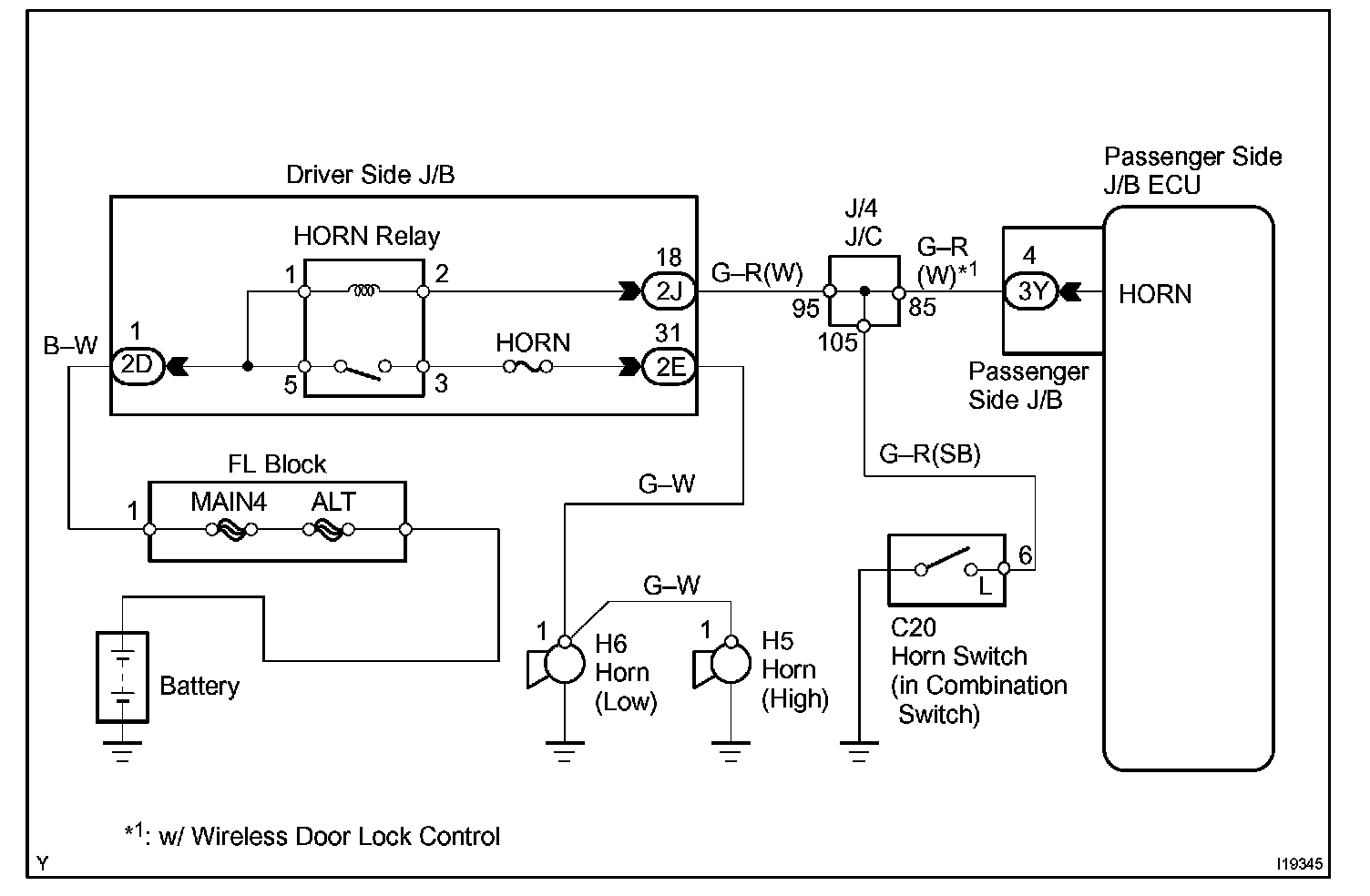 The horns are connected to the passenger side J/B ECU. The horns are activated by the passenger side J/B ECU when the panic button of the wireless door lock system is pressed.
