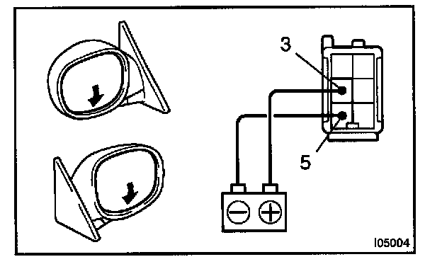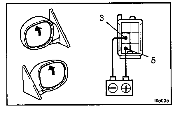 c. Connect the positive (+) lead from the battery to terminal 3 and the negative (-) lead to terminal 5, and check that the mirror turns to the downward.