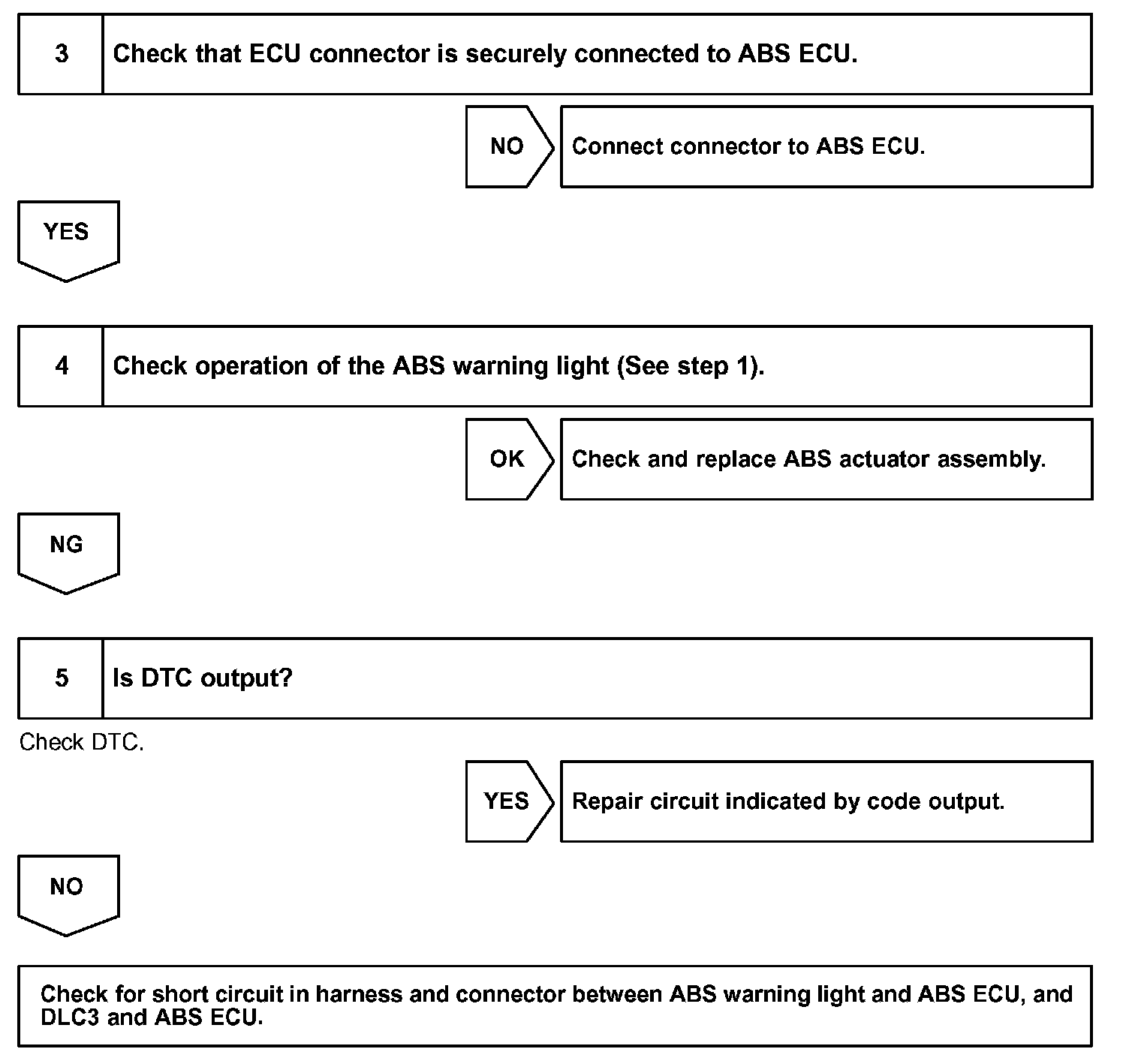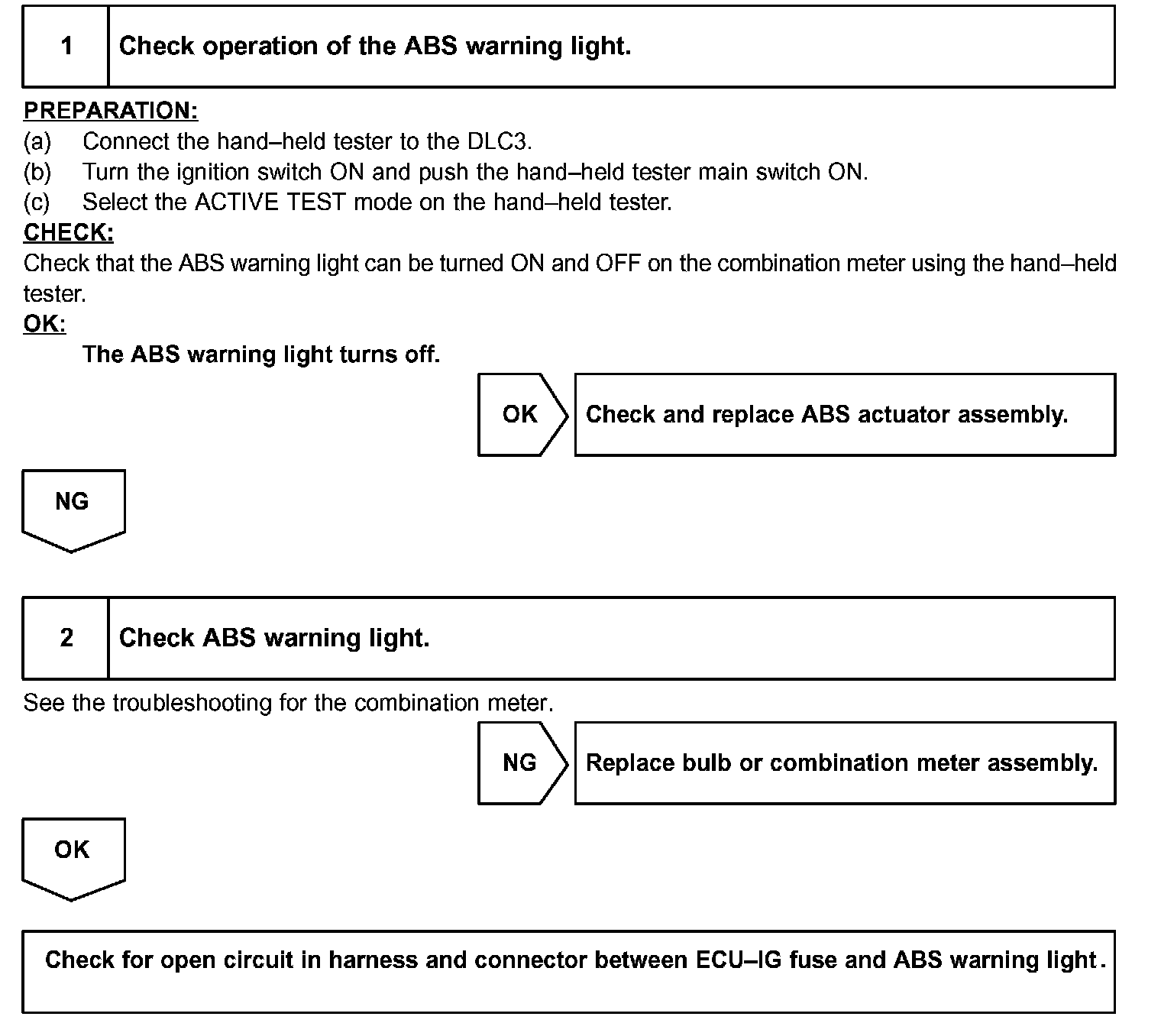 If the ECU detects trouble, the ABS warning light will be illuminated and ABS control will be prohibited. At this time, the ECU records a DTC in memory.