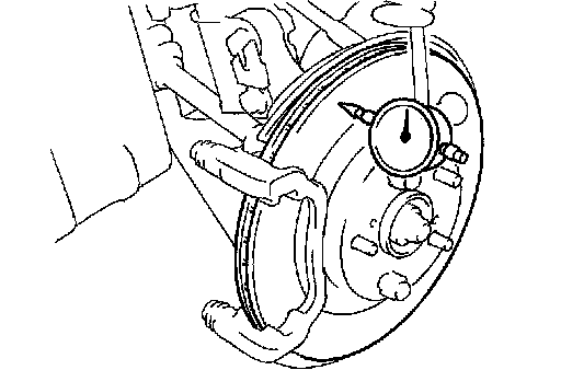 If the disc's runout is at the maximum value or greater, check the bearing play in the axial direction and check the axle hub runout. If the bearing play and axle hub runout are not abnormal, adjust the disc runout or grind it on a "On-Car" brake lathe.