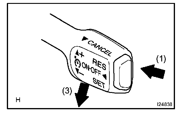 3. Check that the vehicle speed increases while the control switch is turned to +/RES, and that the vehicle cruises at the set speed when the switch is released.