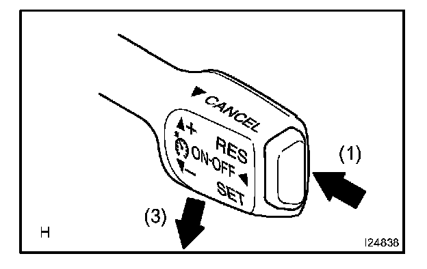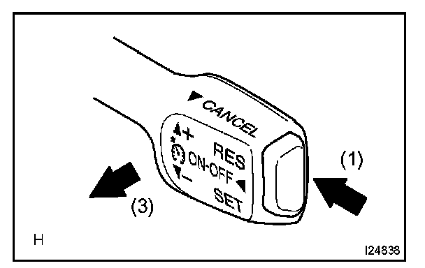 3. Check that the vehicle speed decreases while the control switch is turned to -/SET, and the vehicle cruises at the set speed when the switch is released.