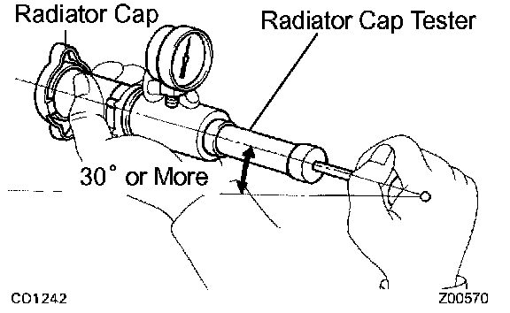 When performing steps (a) and (b) below, keep the radiator cap tester at an angle of over 30° above the horizontal.