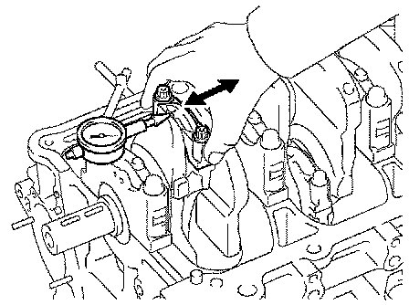 Using a dial indicator, measure the thrust clearance while moving the connecting rod back and forth.