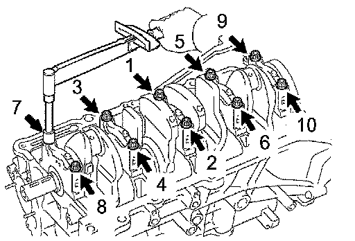 a. Uniformly loosen and remove the 10 main bearing cap bolts in several passes, in the sequence shown.