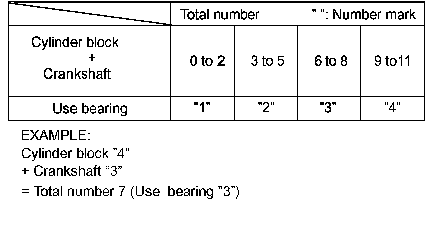 k If using a standard bearing, replace it with one having the same number. If the number of the bearing cannot be determined, select the correct bearing by adding together the numbers imprinted on the cylinder block and crankshaft, then selecting the bearing with the same number as the total. There are 4 sizes of standard bearings, marked 1, 2, 3 and 4 accordingly.