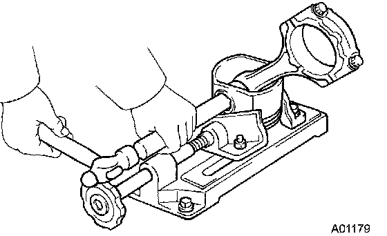 c. Using a plastic-faced hammer and a brass bar, lightly tap out the piston pin and remove the connecting rod.