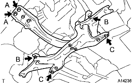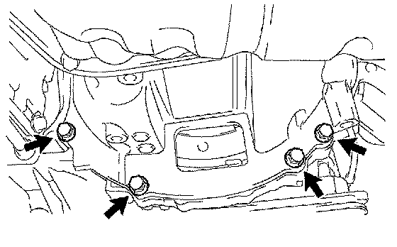 f. Install the 6 bolts holding the suspension crossmember engine mounting member to the body.