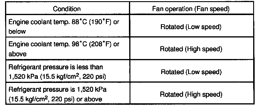 If operation is not as specified, replace the fan motor. If operation is as specified, check the pressure switch, cooling fan relays and water temperature switch.