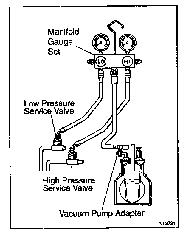 b. Connect the center hose of the manifold gauge set to the vacuum pump adapter.