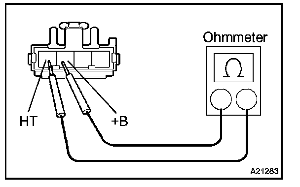 b. Using an ohmmeter, measure the resistance between terminals +B and HT.