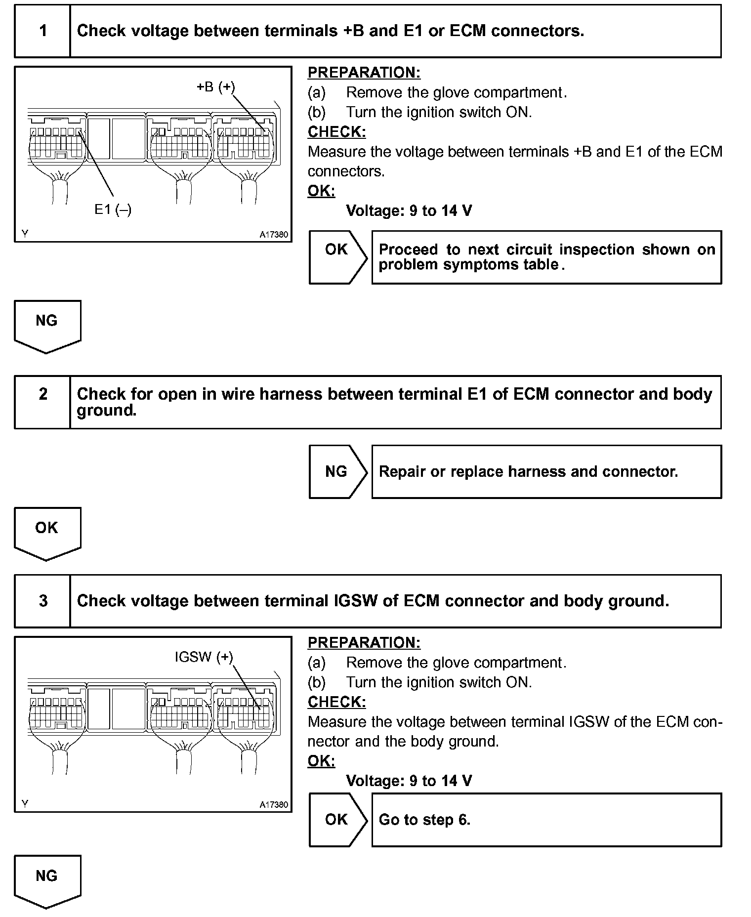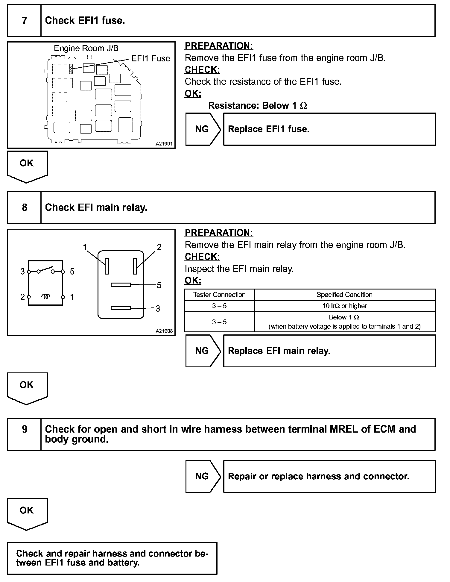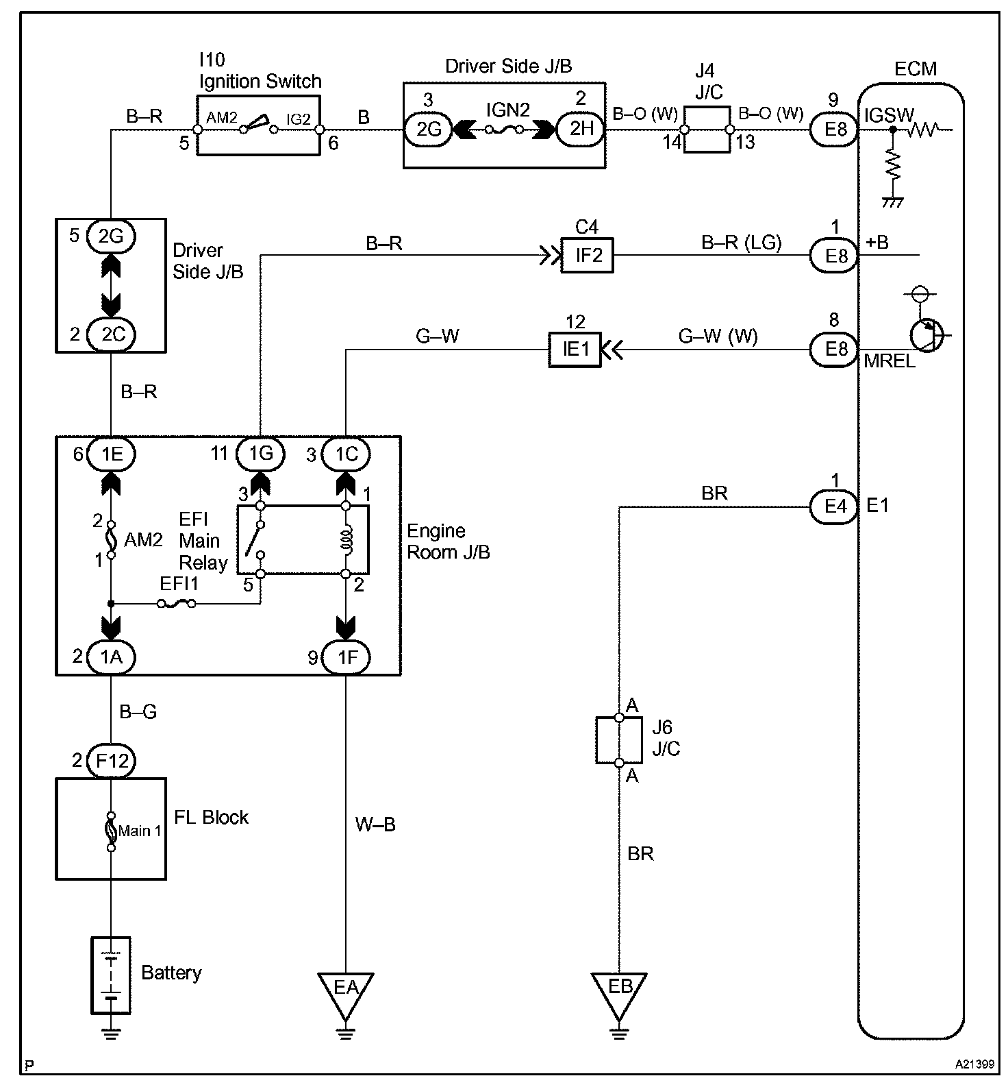 When the ignition switch is turned ON, battery voltage is applied to terminal IGSW of the ECM. The ECM "MREL" output signal causes current to flow to the coil, closing the contacts of the EFI main relay and supplying power to terminal +B of the ECM.