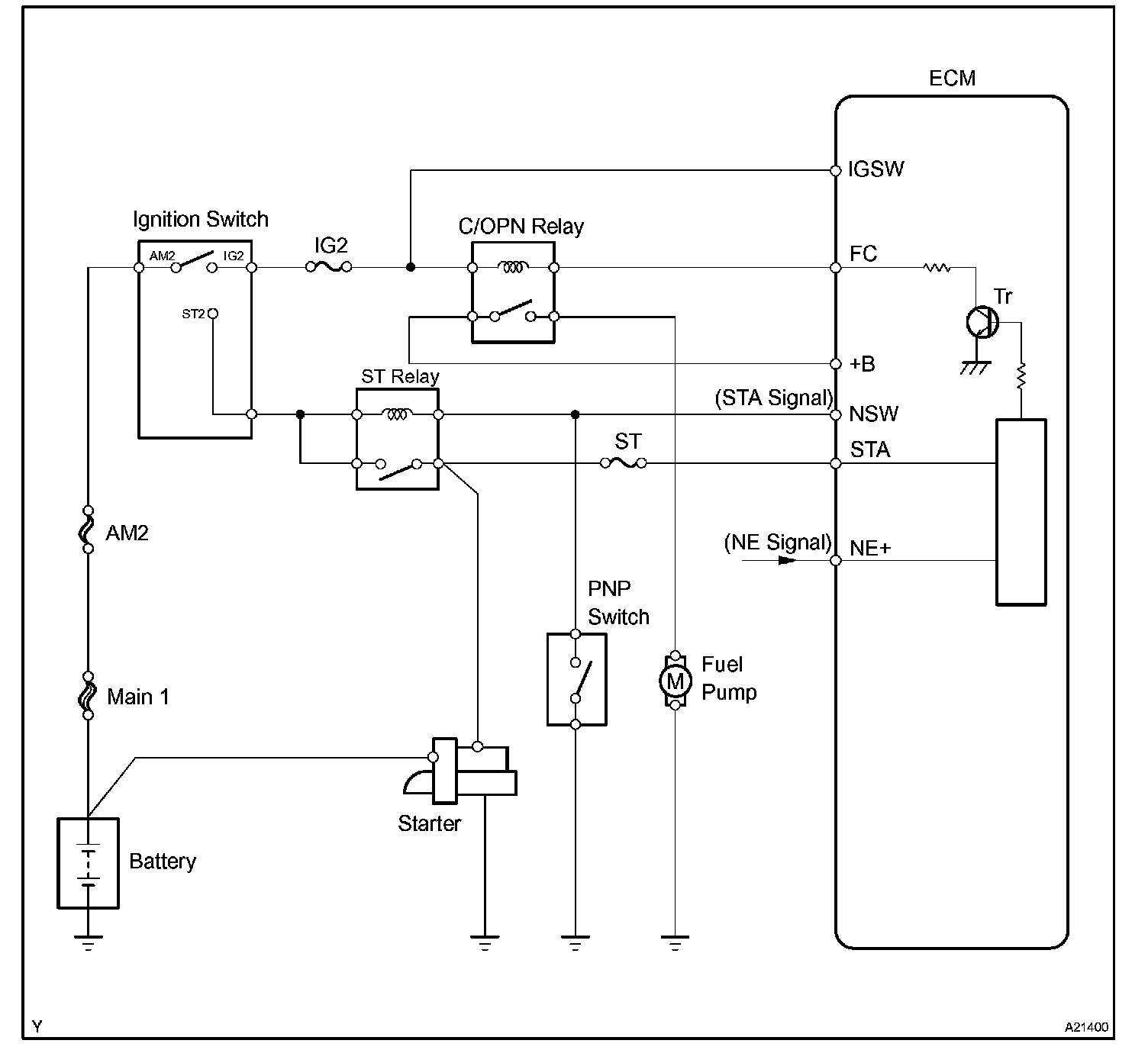 When the engine is cranked, current flows from the ignition switch terminal ST1 to the starter relay coil (Marking: ST), and current flows to terminal STA of the ECM (STA signal).