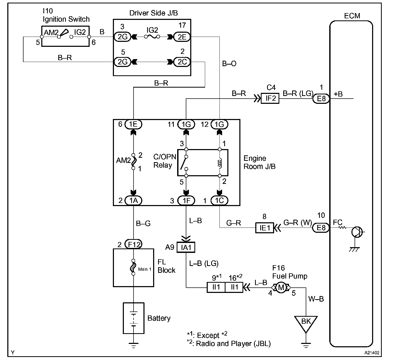 While the NE signal is generated and the engine is running, the ECM keeps Tr ON (C/OPN relay ON) and the fuel pump also keeps operating.