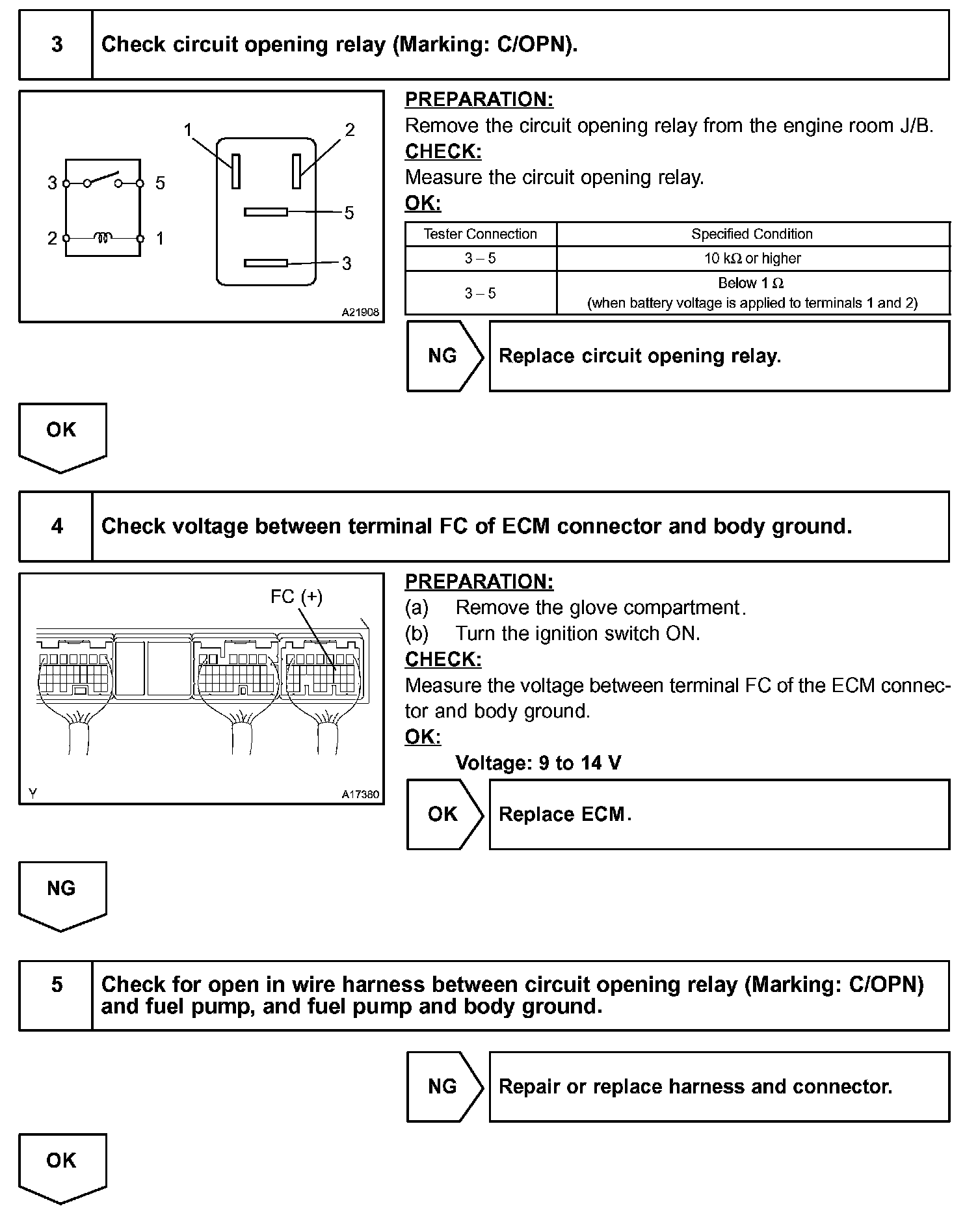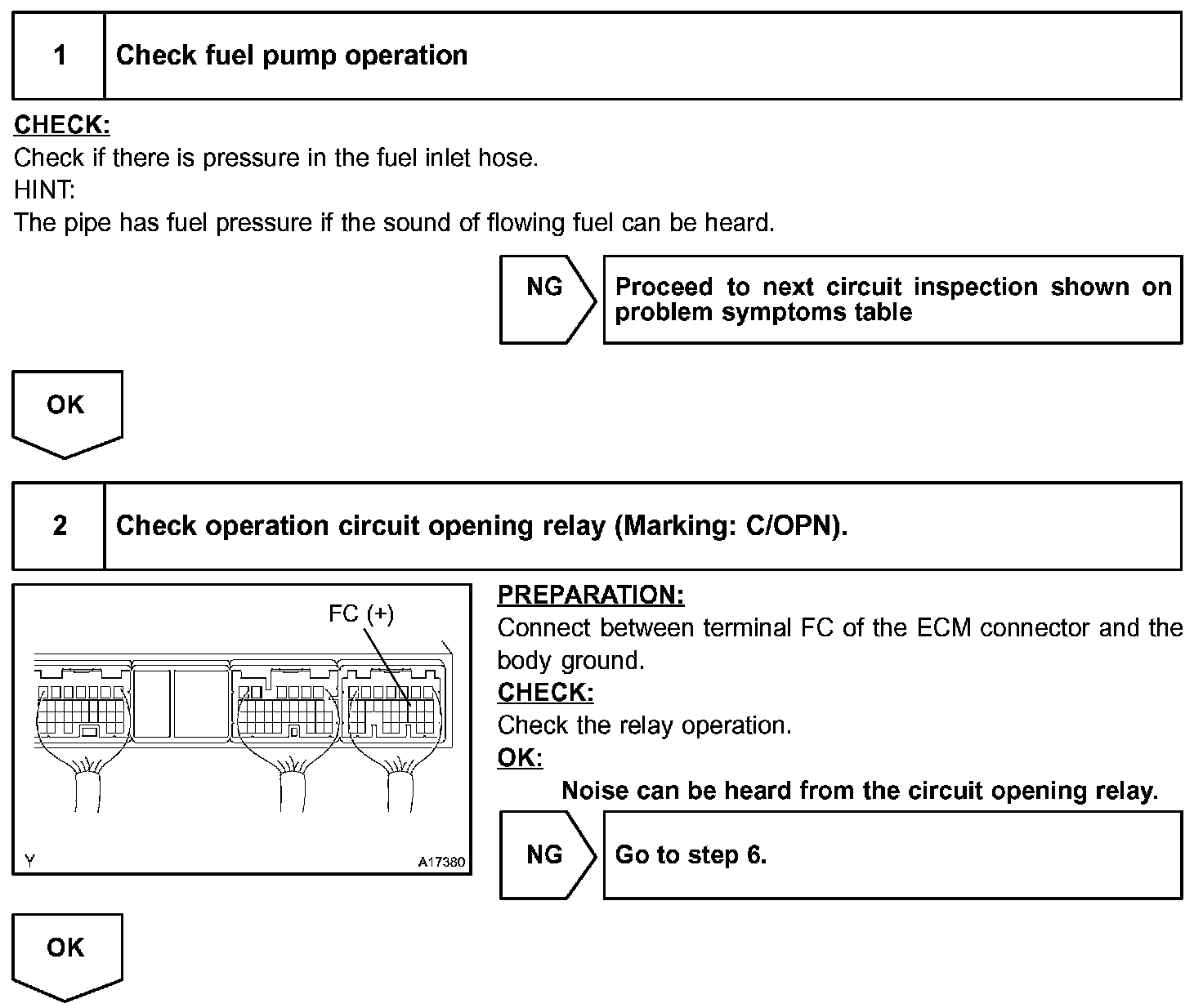 When the STA signal and NE signal are input to the ECM, Tr is turned ON, current flows to coil of the circuit opening relay (Marking: C/OPN), the relay switches ON, power is supplied to the fuel pump and the fuel pump operates.
