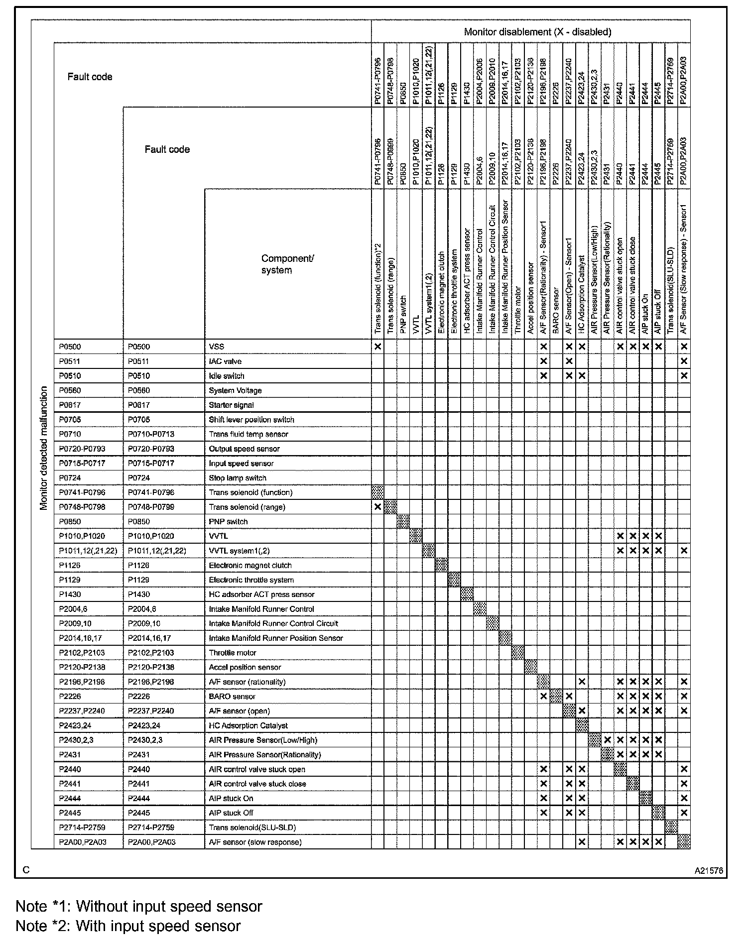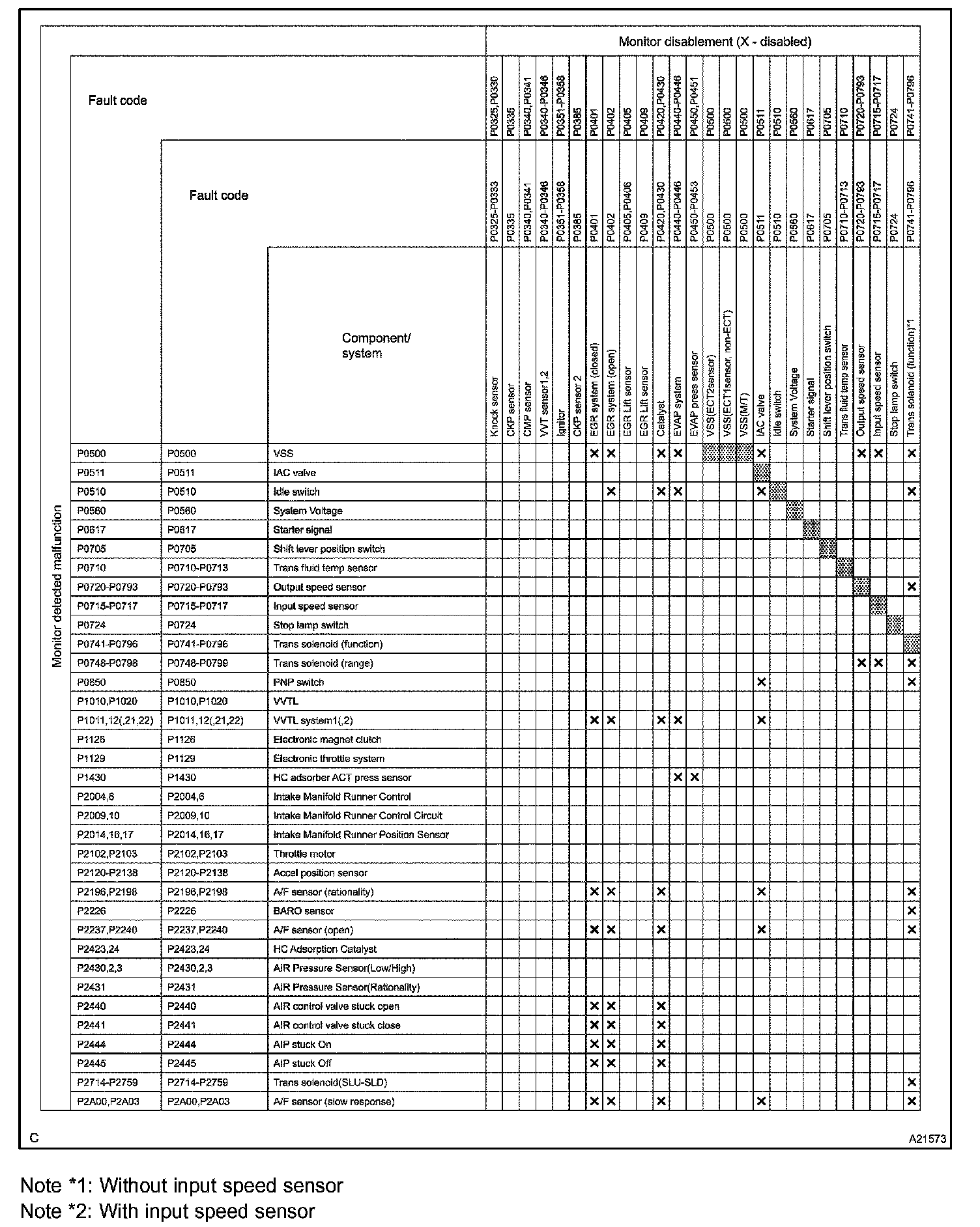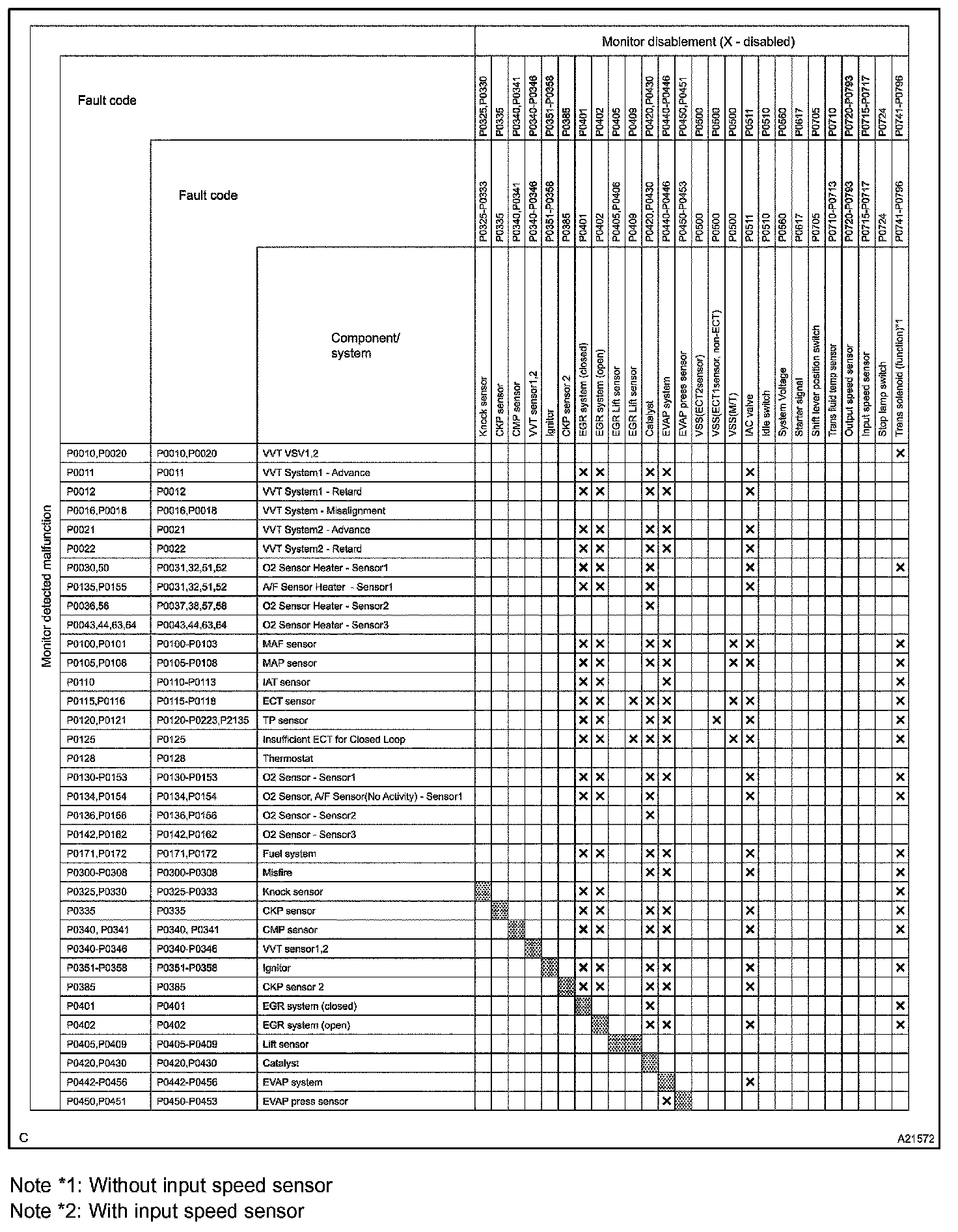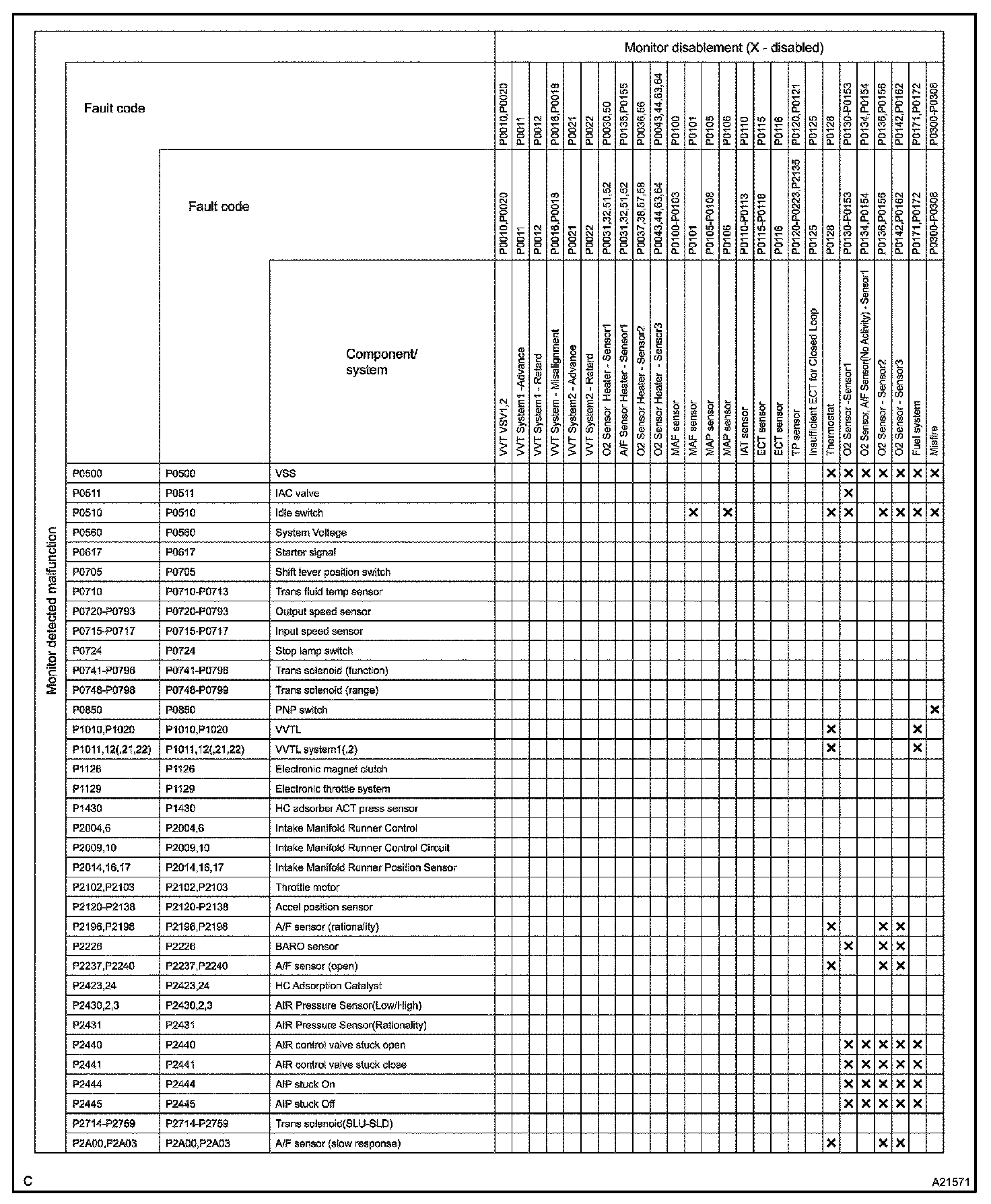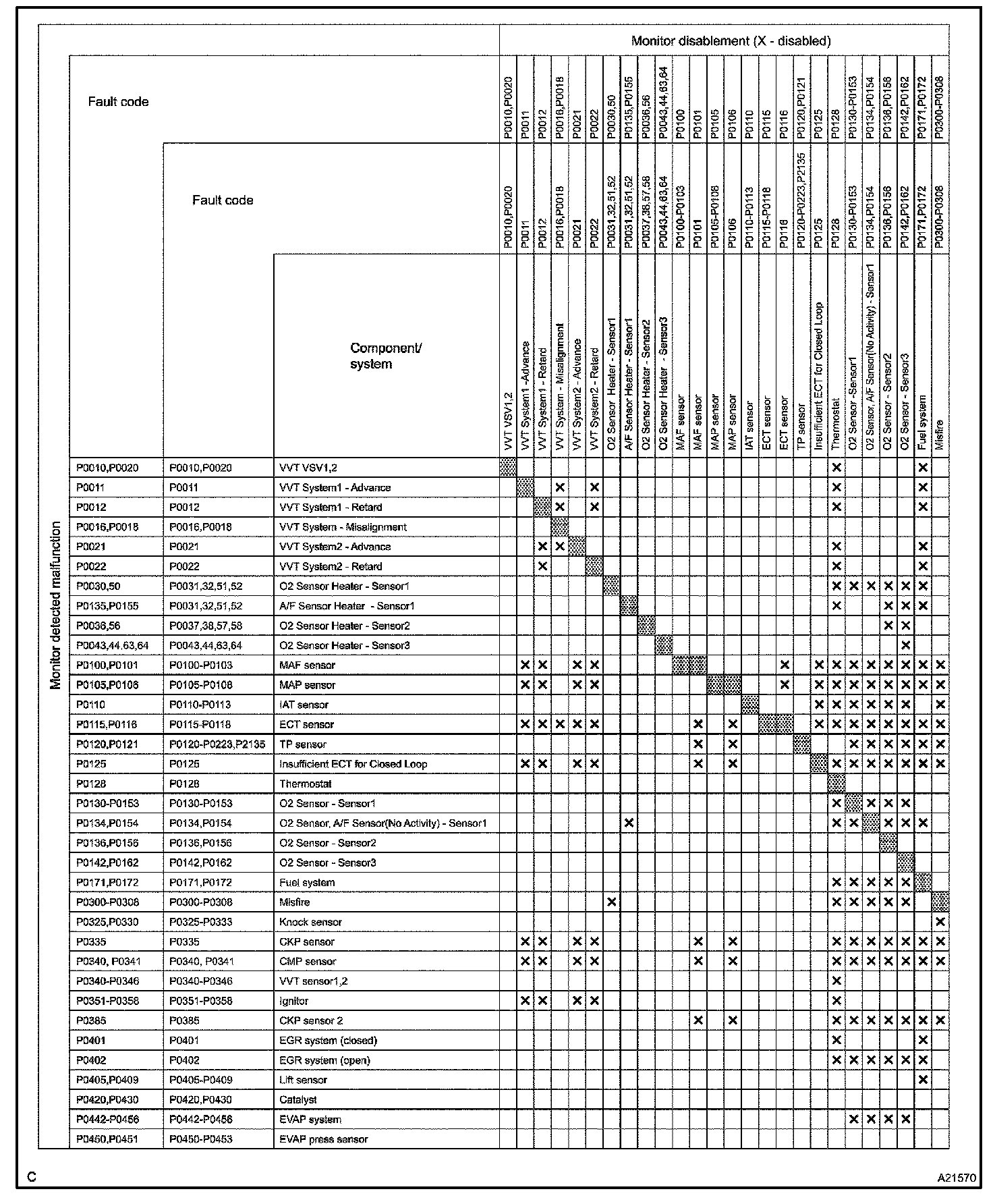 LIST OF DISABLE A MONITORHINT: This table indicates ECM monitoring status for the items in the upper columns if the DTCs in each line on the left are being set.