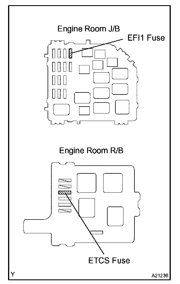 1. Remove the EFI1 fuse from the engine room J/B and ETCS fuse from the engine room R/B for more than 60 seconds. Or, disconnect the battery terminal for more than 60 seconds. After disconnecting the battery terminal, perform the "INITIALIZE" procedure.