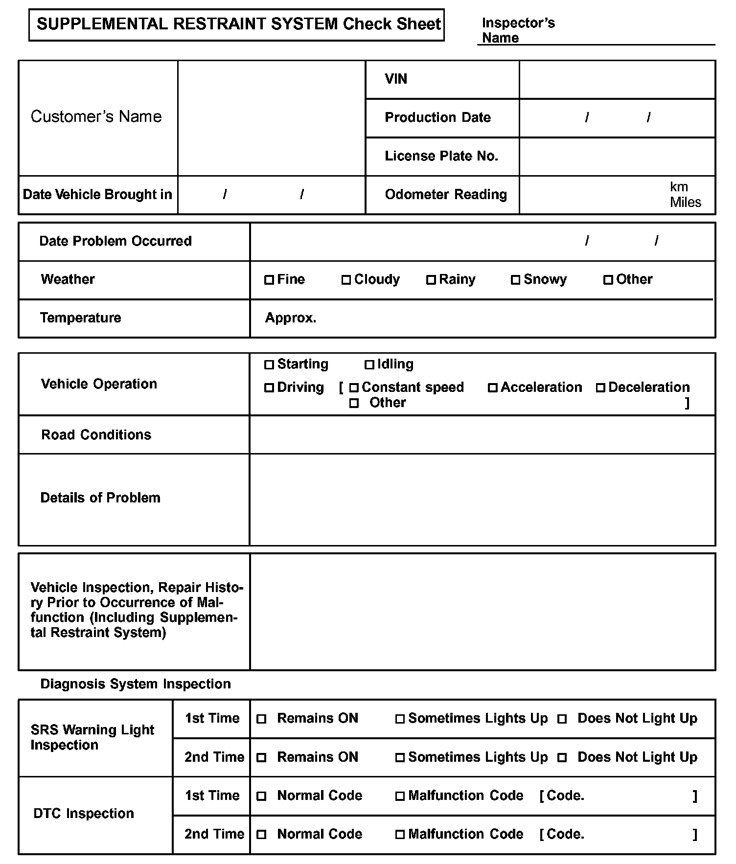 Supplemental Restraint System Check Sheet: