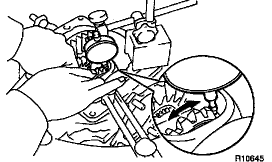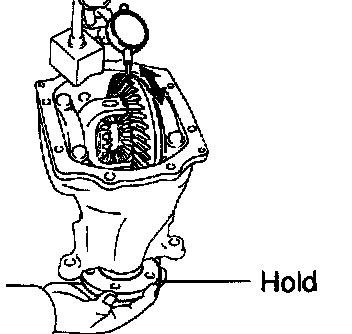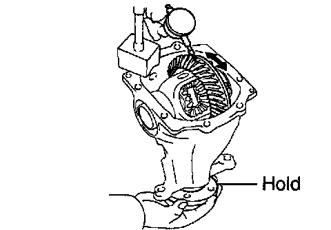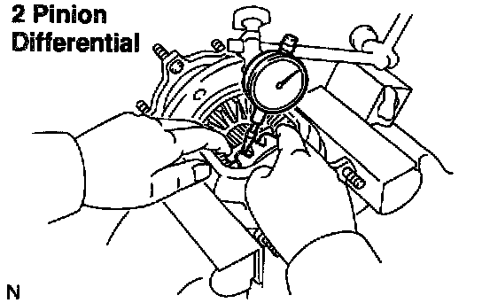 Using a dial indicator, check the backlash of the side gear with holding 1 pinion gear toward the differential case.