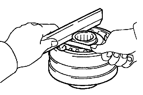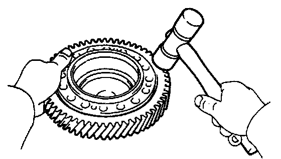 b. Using a brass bar and hammer, drive out the tapered roller bearing outer race lightly and evenly.