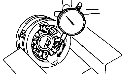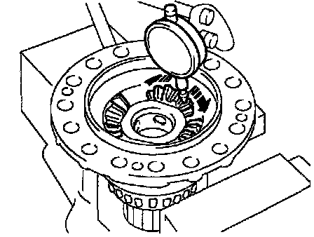 b. Using a dial indicator, measure the backlash of one pinion gear while holding the front differential side gear toward the case.