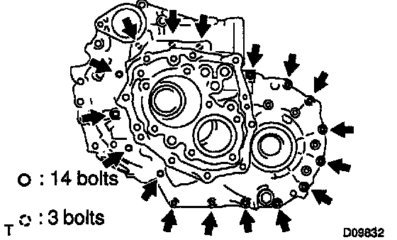 h. Remove the 17 bolts, tap the transmission case with a plastic hammer and remove it.