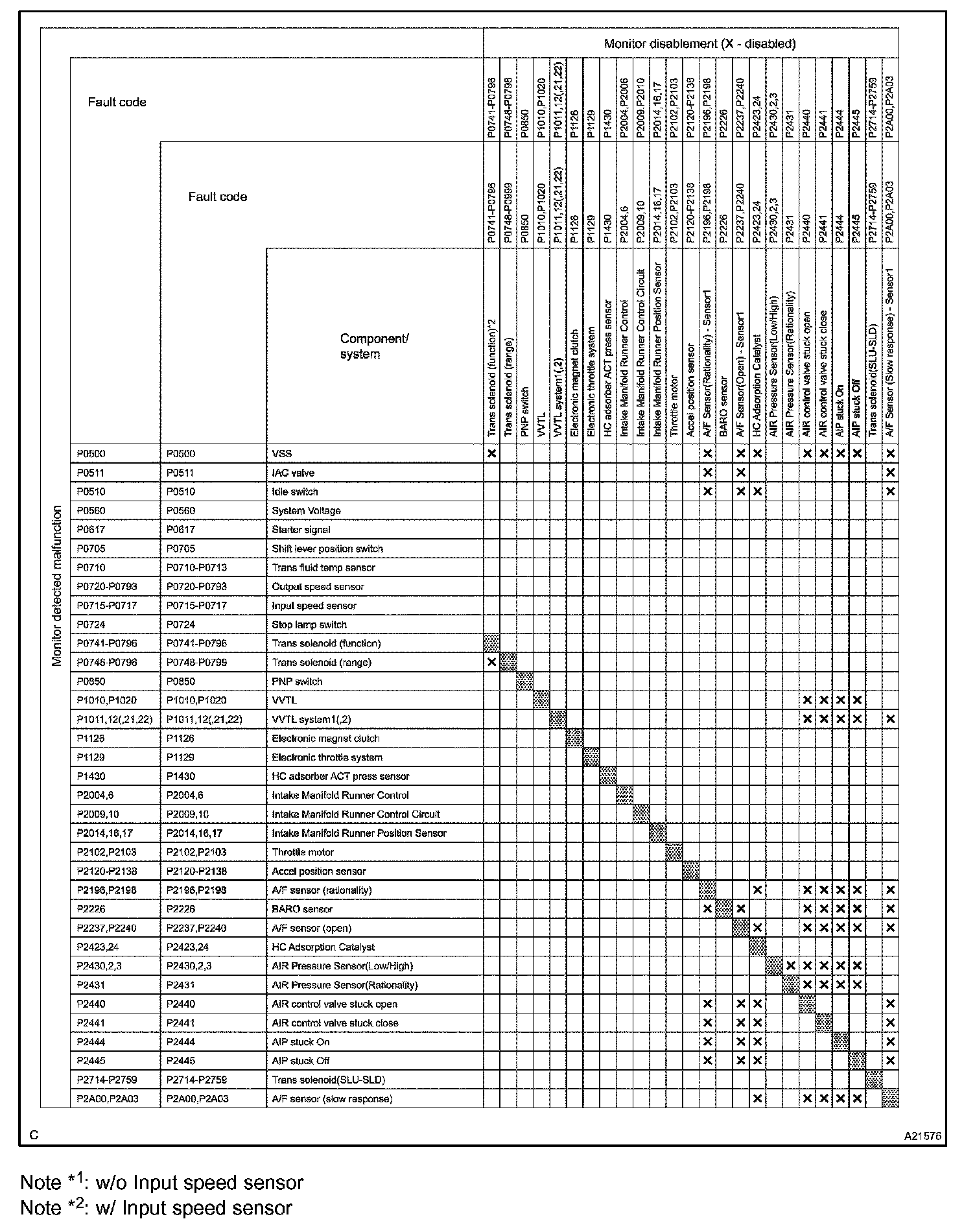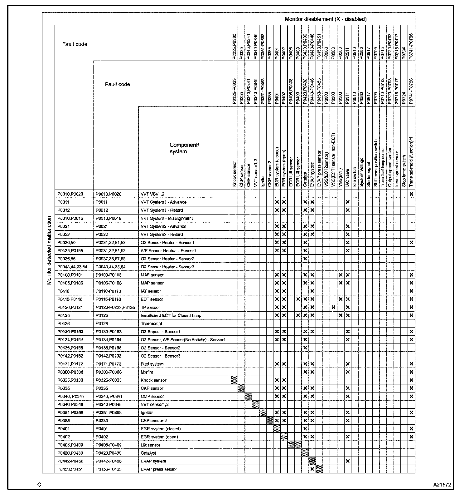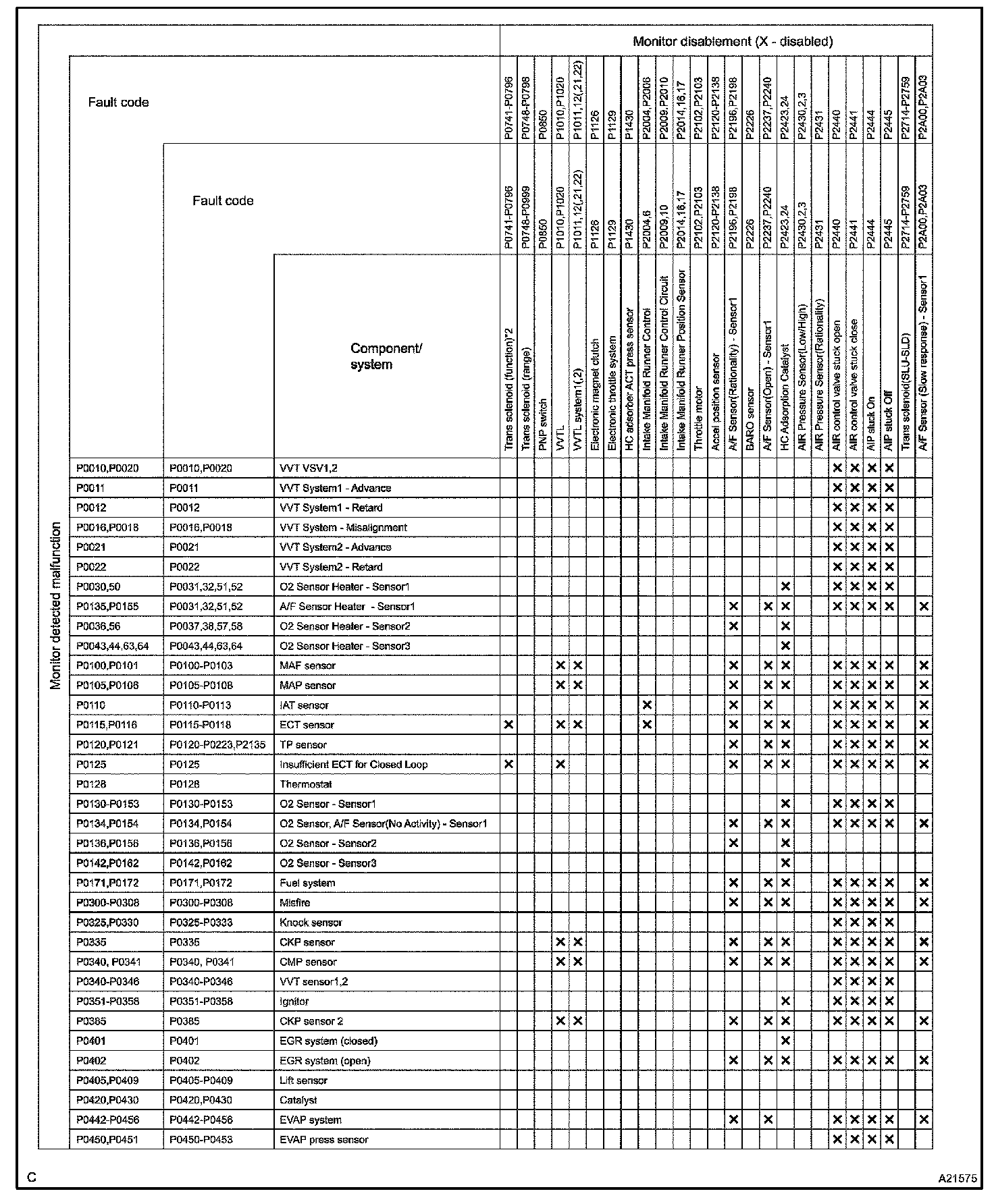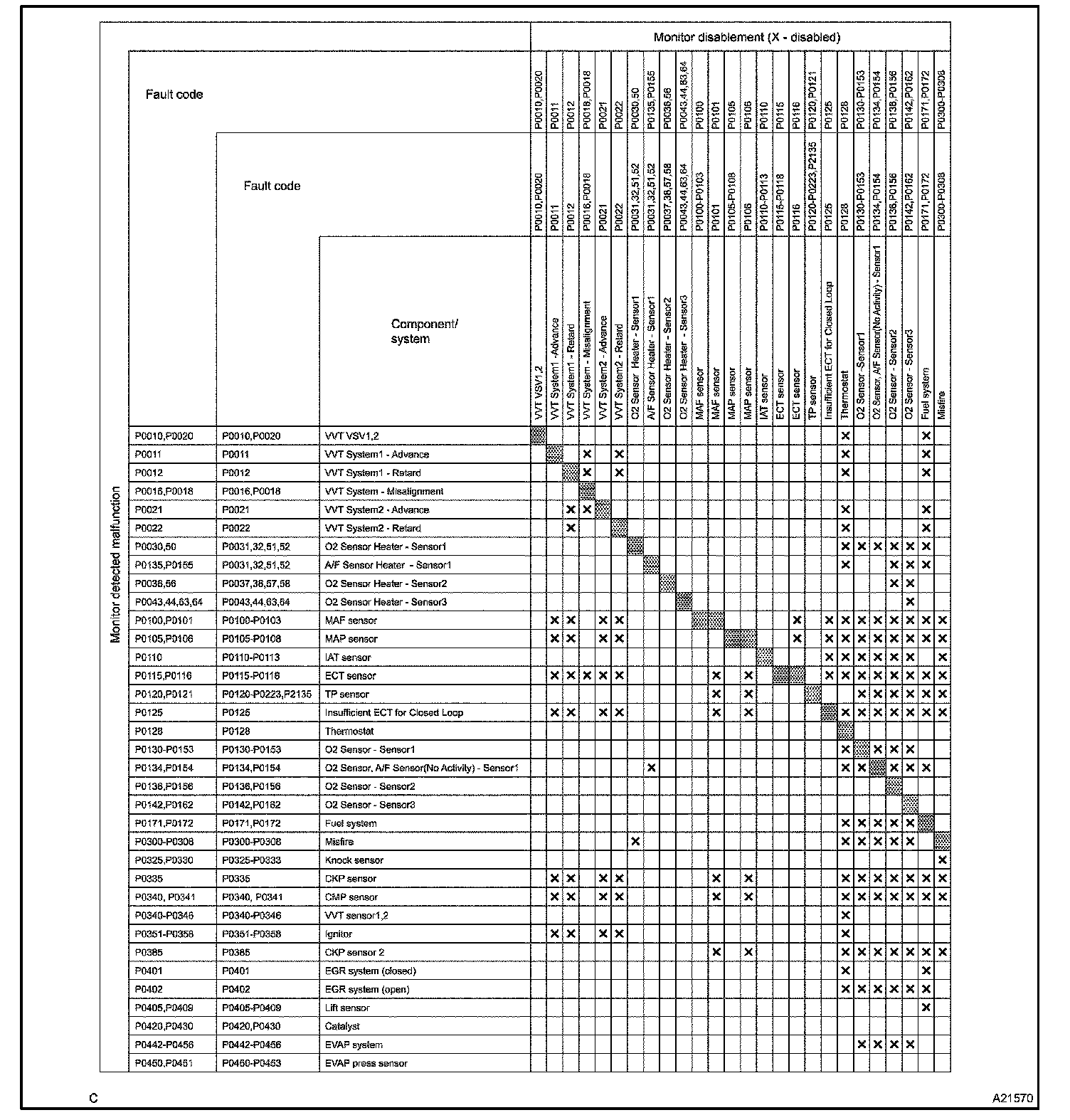 The monitor will run whenever the following DTCs are not present (Monitor disablement List)HINT: This table indicates ECM monitoring status for the items in the upper columns if the DTCs in each line on the left are being set.