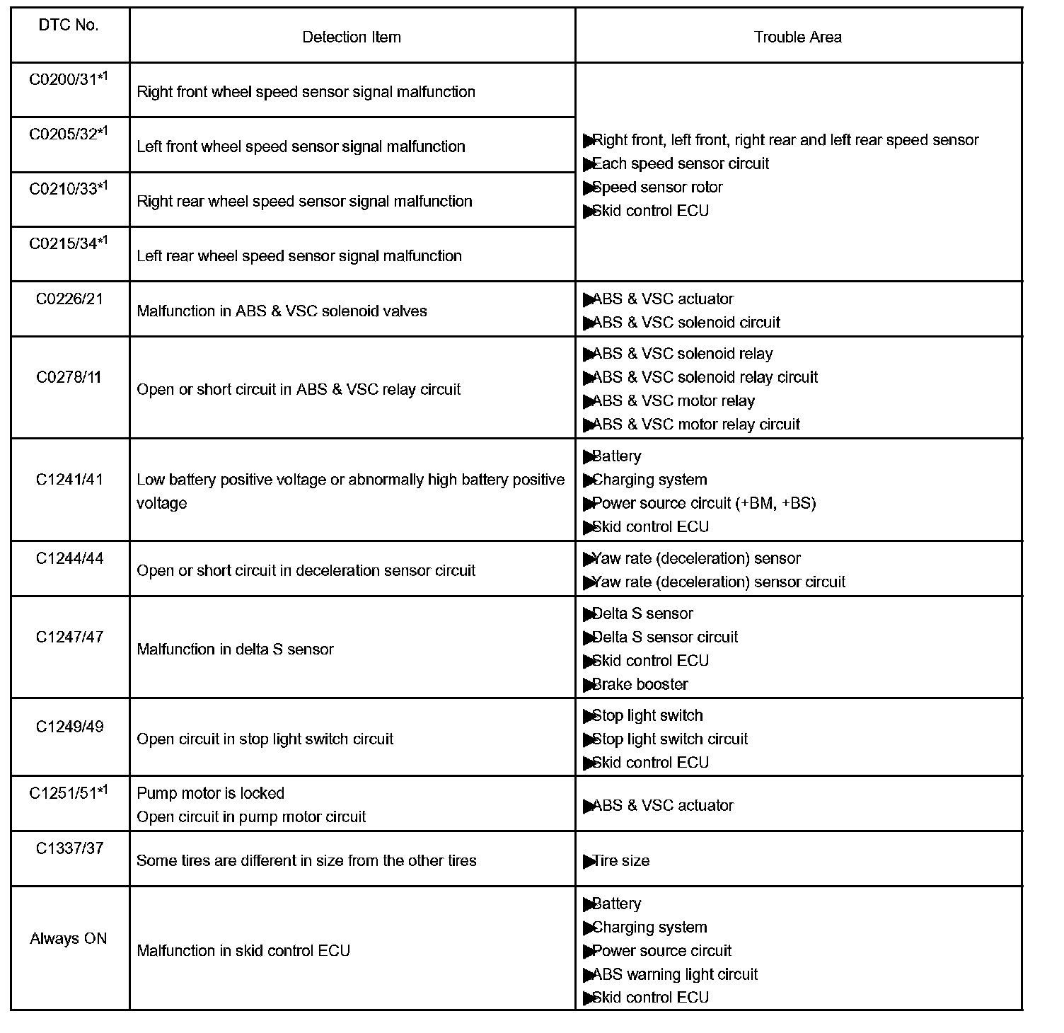 DTC chart of ABS system: