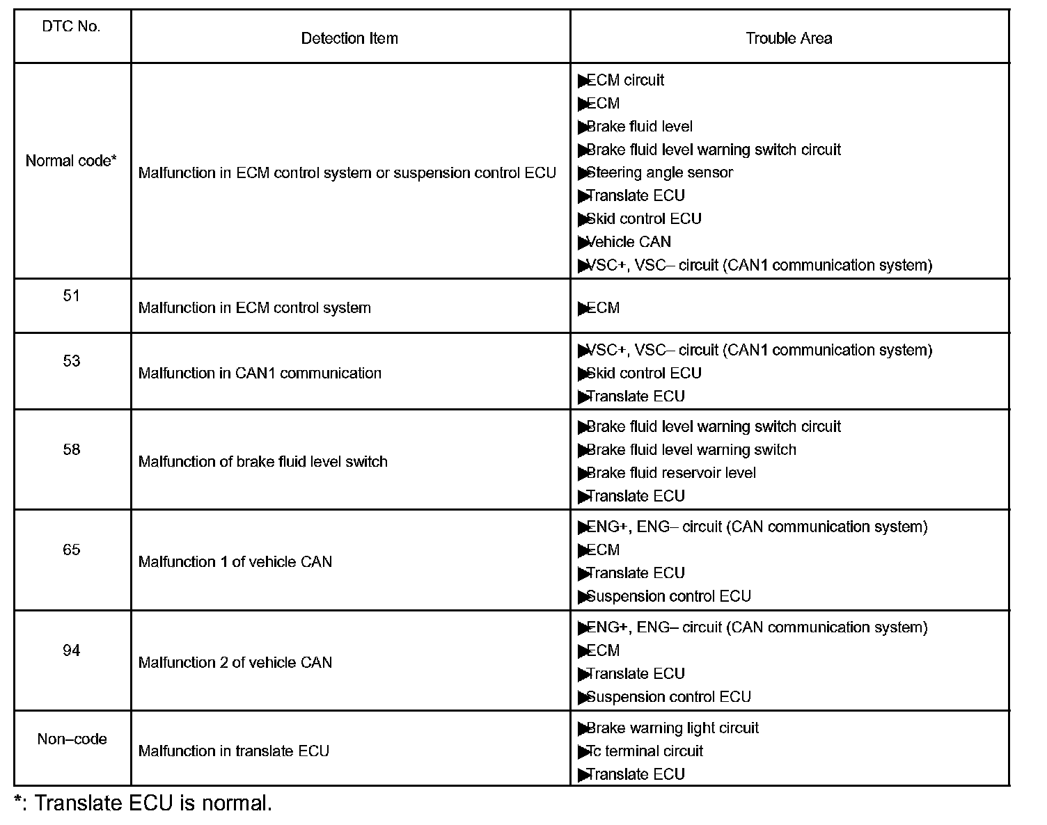 DTC chart of translate ECU (When DTC "C1201/51, C1202/52, C1203/53 or U0100/65" of VSC system is output):