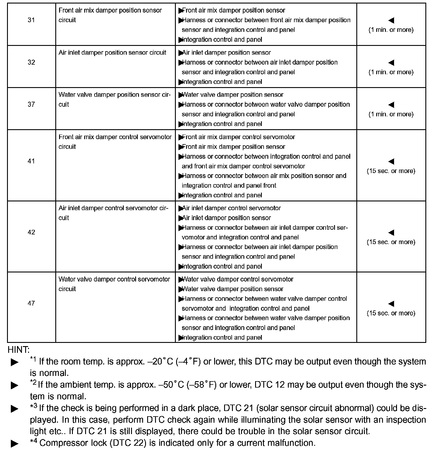 If a malfunction code is displayed during the DTC check, check the circuit listed for that code in the table.