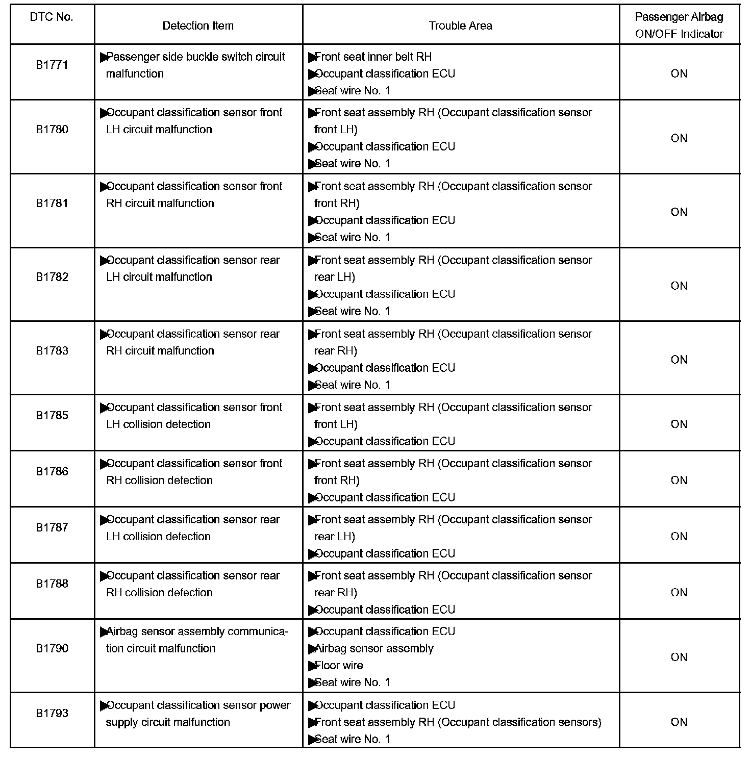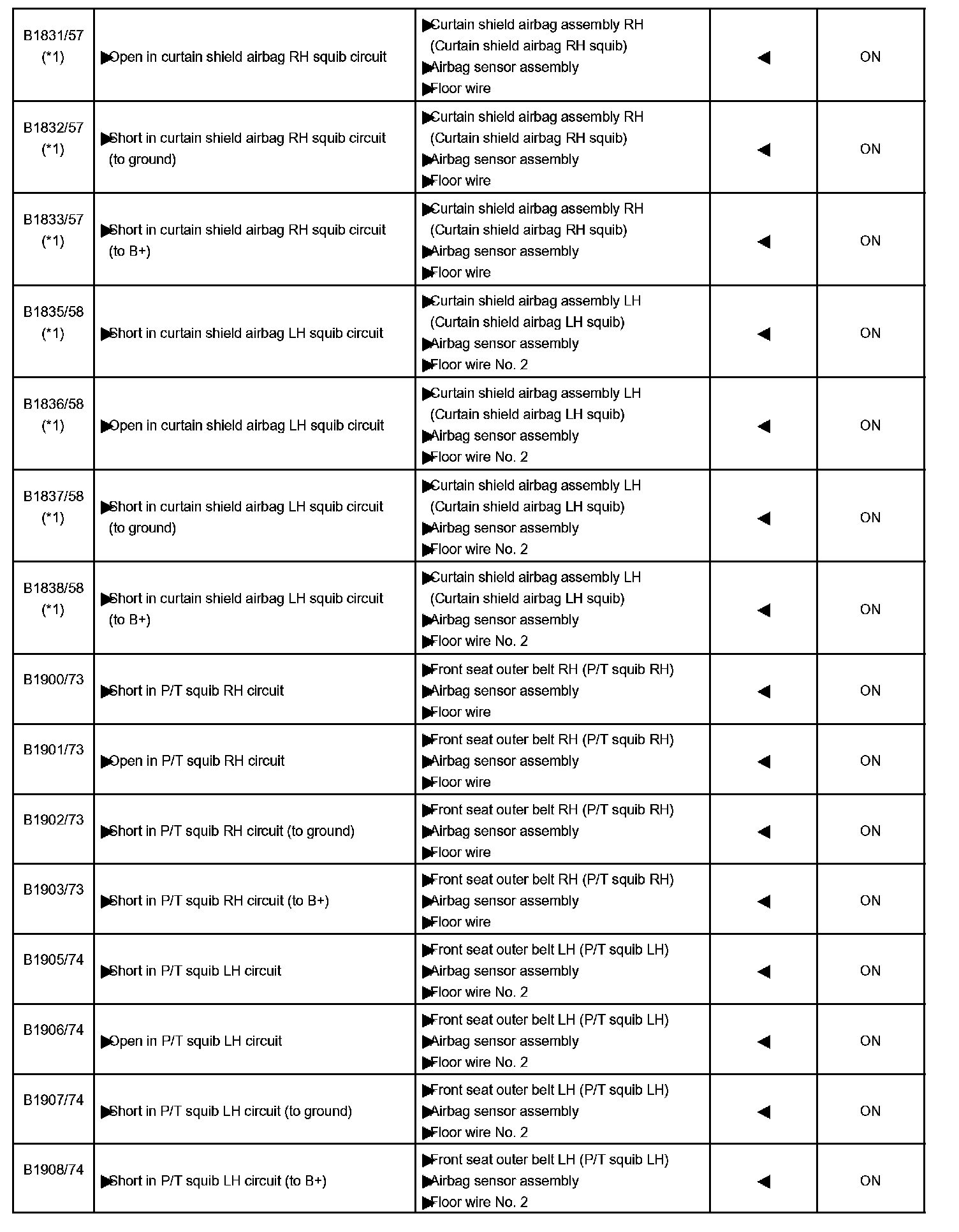 - In the case of any malfunction concerning an open circuit, short to ground, or short to B+ due to a squib, other malfunction codes may not be detected. In this case, repair the malfunction currently indicated and then perform malfunction diagnosis again.