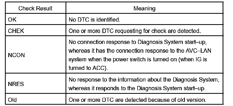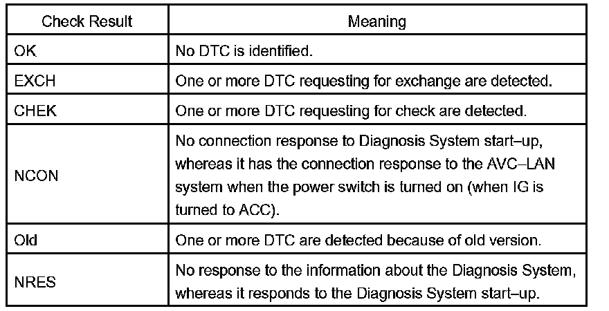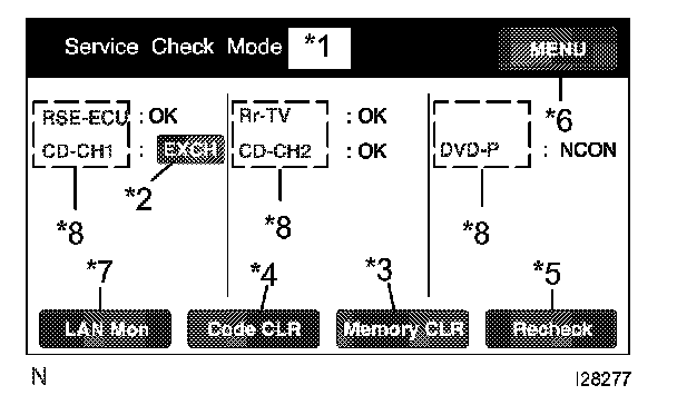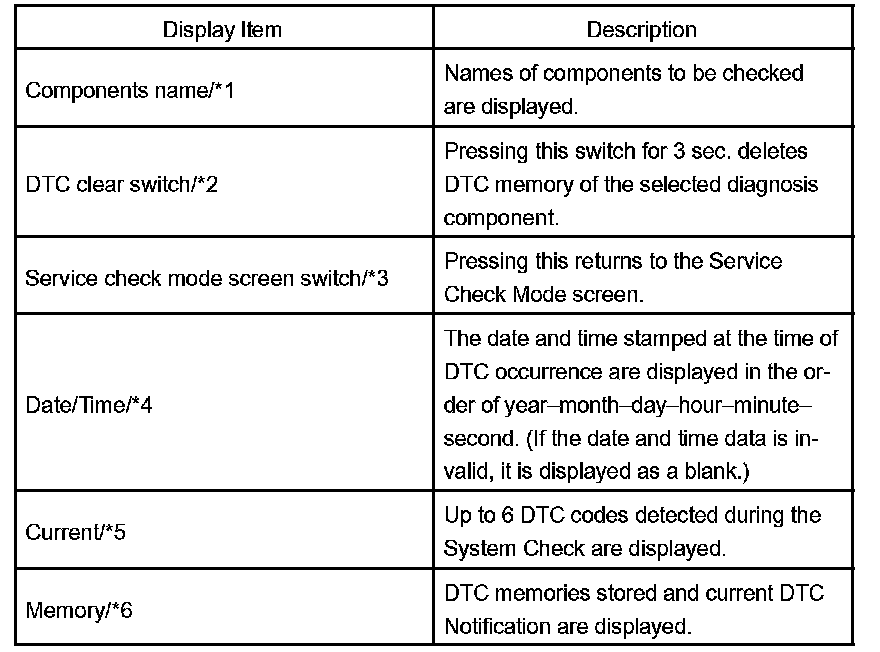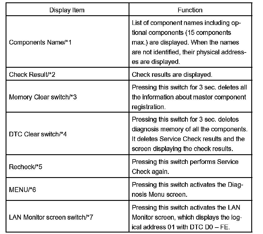 HINT: Service Check displays the check results based on the information obtained from each component's response to "System Check Execution" and "Diagnosis Memory Request", and the information of "Current DTC Notification" (the Unit Check that will be displayed on the next screens.).