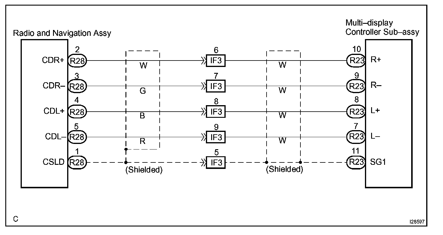 This is the sound signal circuit from the multi-display controller sub-assy to the radio and navigation assy.