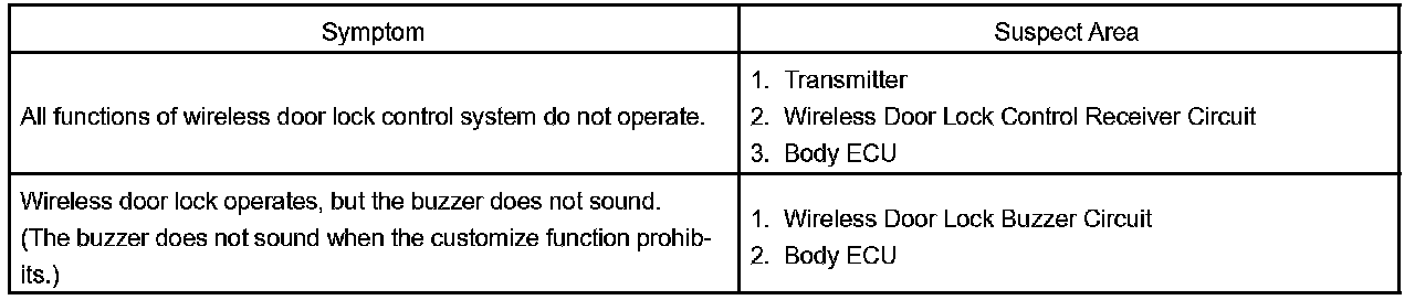 - If the trouble still reappears even though there are no abnormalities in any of the other circuits, check and replace the Wireless Door Lock Control Receiver as the last step.