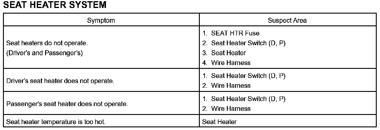 Problem Symptoms Table - Seat Heater System: