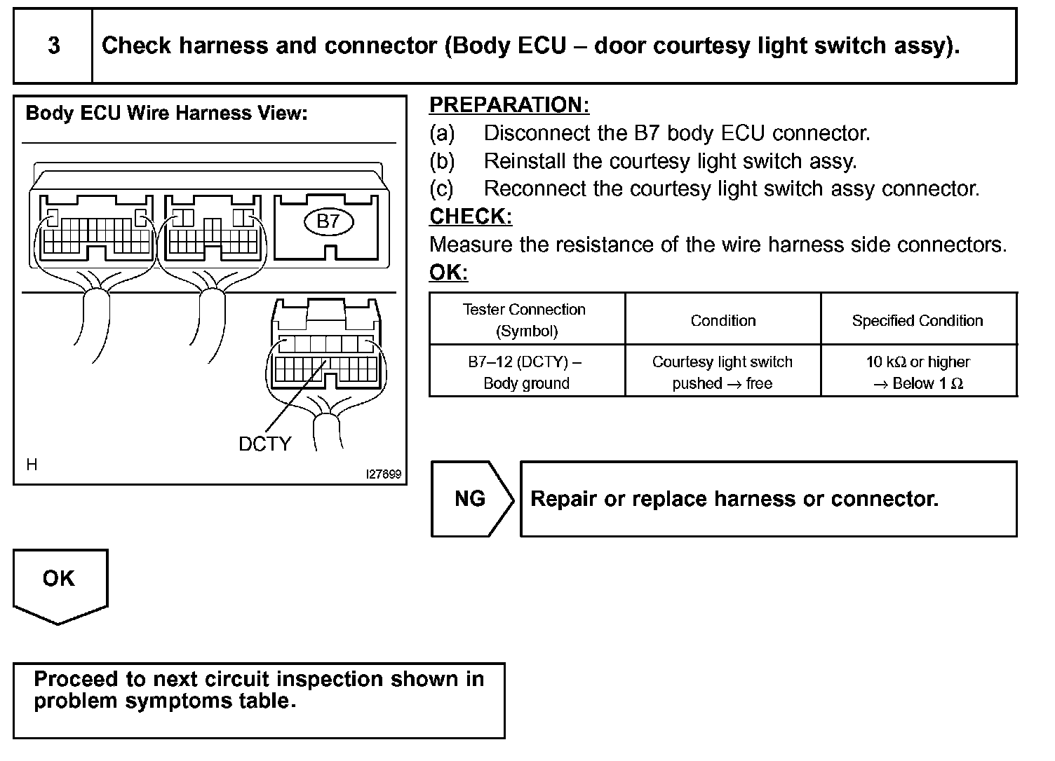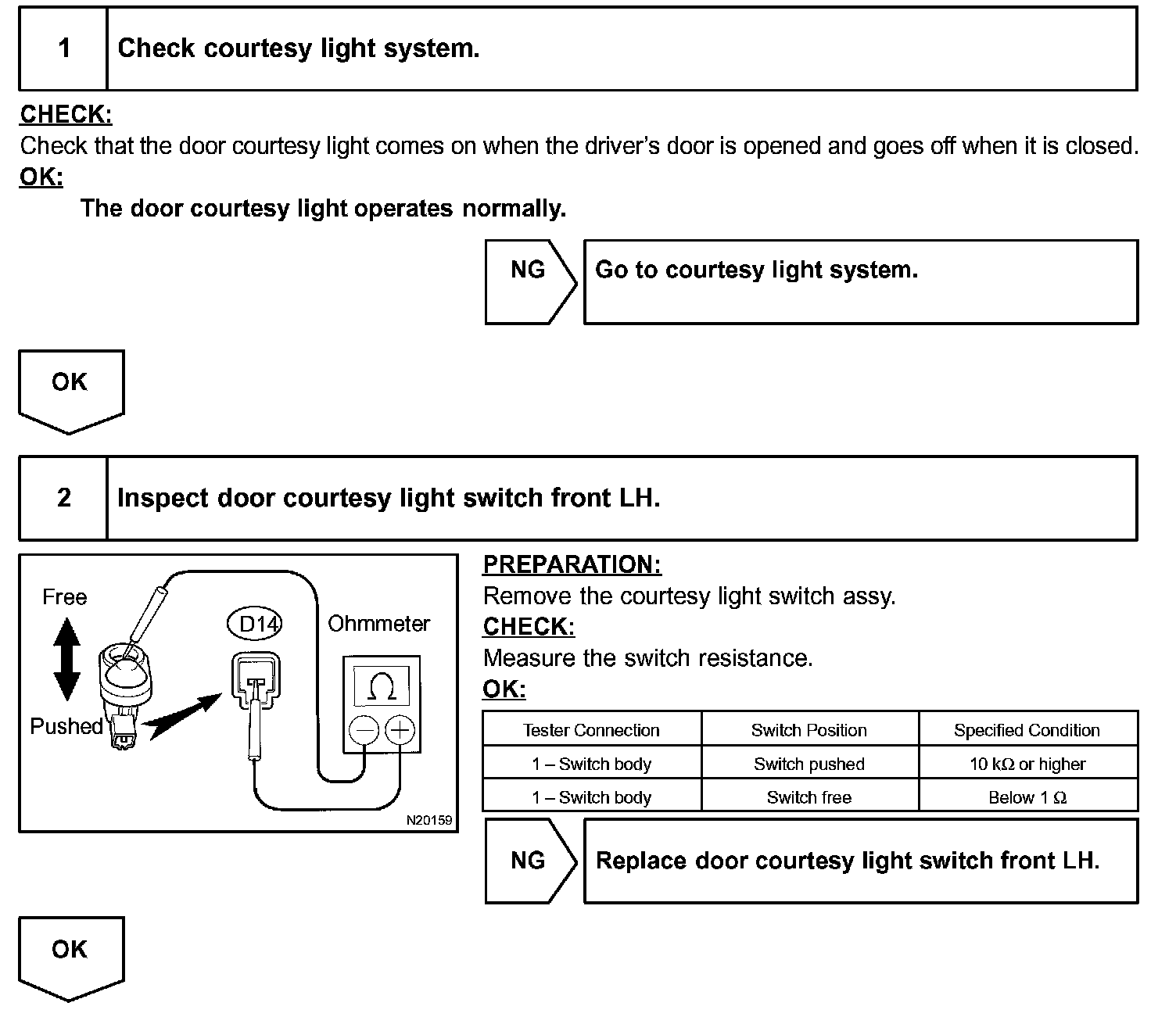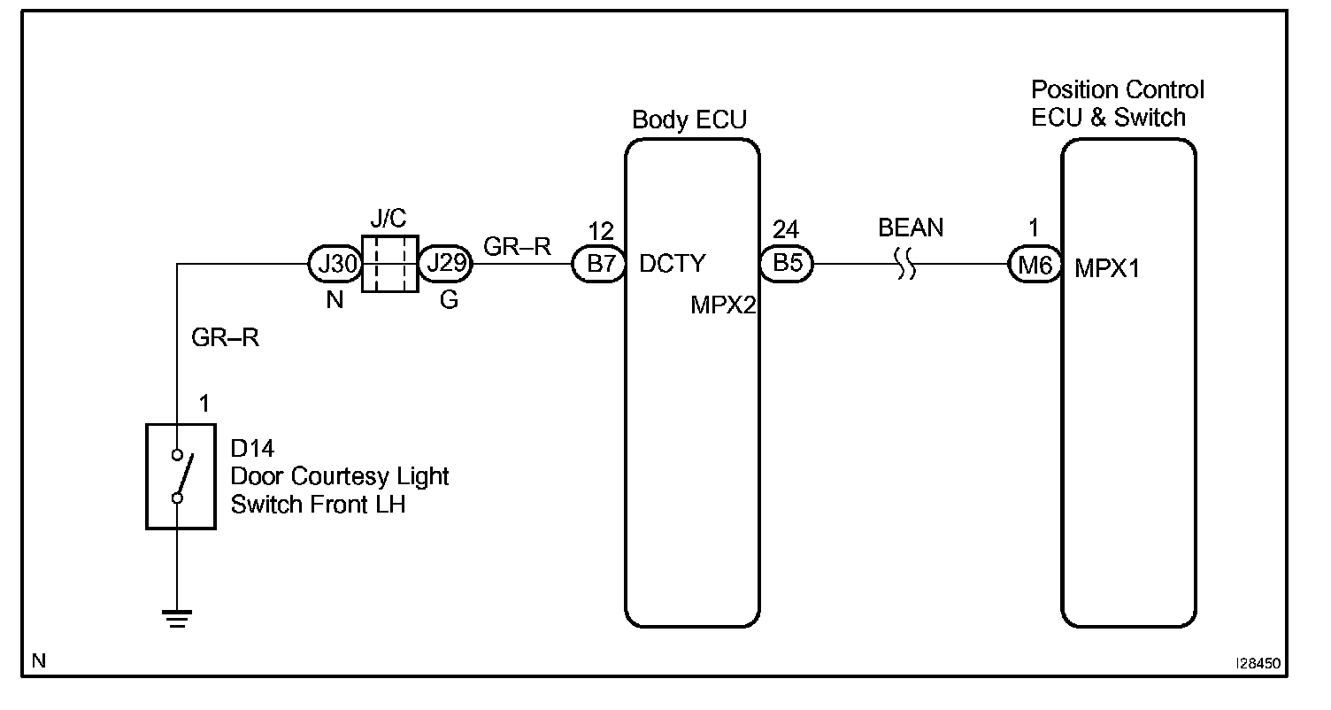 The position control ECU & switch assembly detects the open/close condition of the driver's door, via multiplex communication, through the front door courtesy light switch.