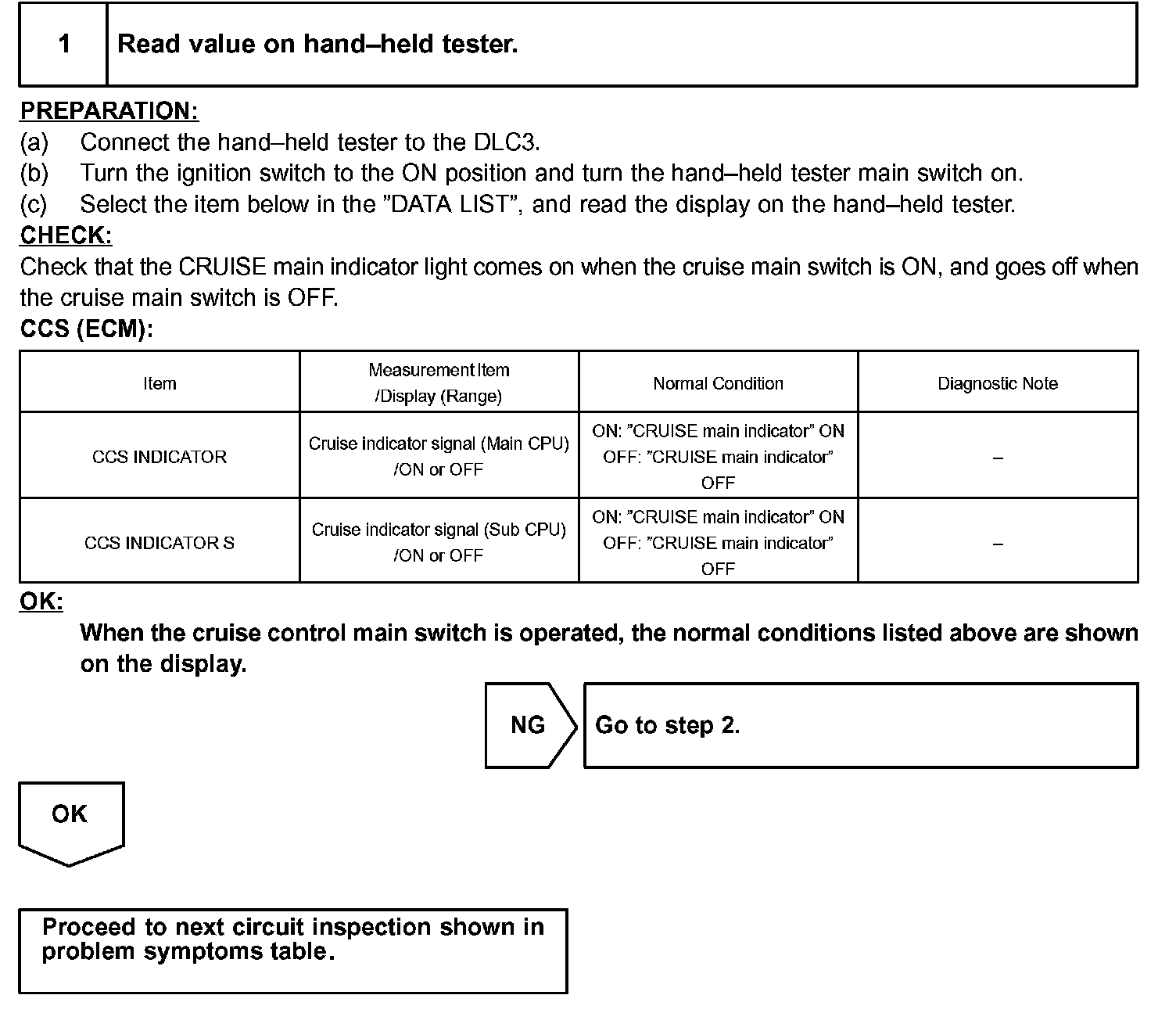 HINT: When using the hand-held tester, start the inspection from 1 and when not using the hand-held tester, start from step 2.