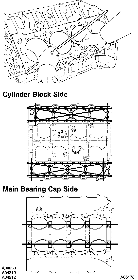 Using a precision straight edge and feeler gauge, measure the surfaces contacting the cylinder head and main bearing cap for warpage.