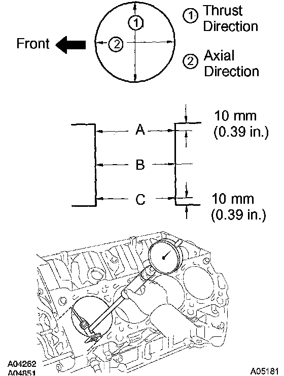 Using a cylinder gauge, measure the cylinder bore diameter at positions A, B and C in the thrust and axial directions.