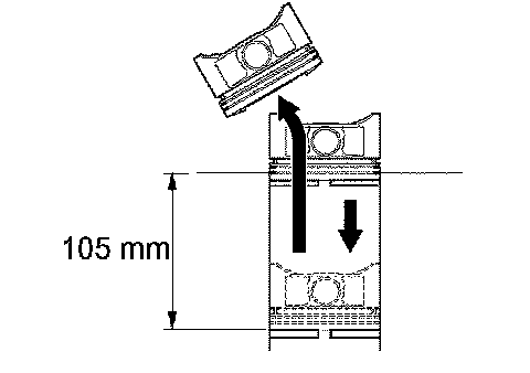 2. Using a piston, push the piston ring a little to the bottom of the ring travel, 105 mm (4.13 inch) from the top of the cylinder block.