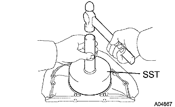 4. Using SST and a hammer, tap in the oil seal until its surface is flush with the rear oil seal retainer edge.