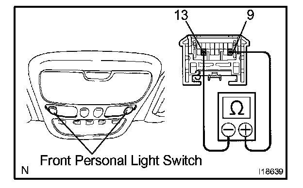 b. Push the personal light switch ON, check that continuity exists between terminal 9 and terminal 13.