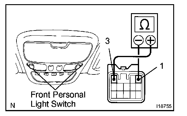 b. Push the personal light switch ON, check that continuity exists between terminal 1 and terminal 3.
