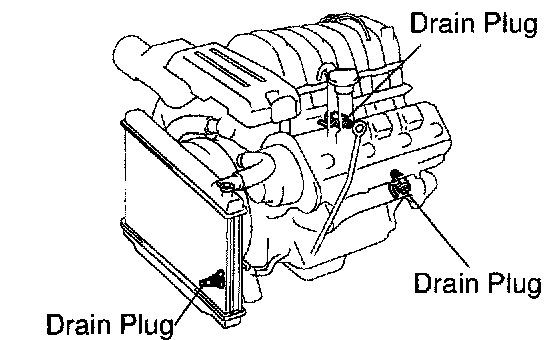 b. Remove the 3 drain plugs on the engine and radiator, and drain the coolant.